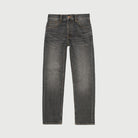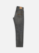 High-waist, regular-fit jeans with a straight leg, featuring a bold grey wash and contrasting details. Crafted from black denim with a rugged crosshatch texture, these jeans highlight rich highs and lows, accentuated by a pronounced slub character. Abrasions and sharp wear marks deepen their unique, bold, and monochromatic look.