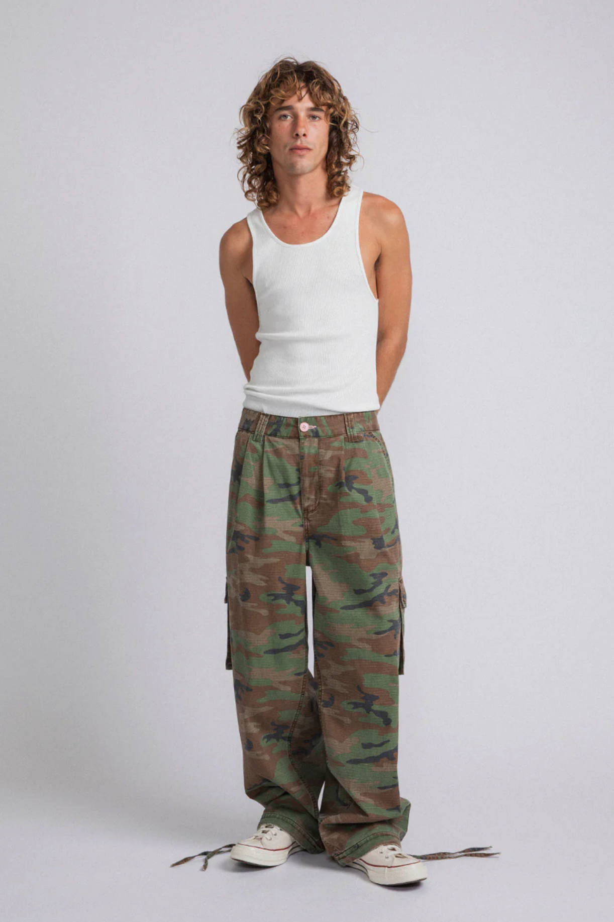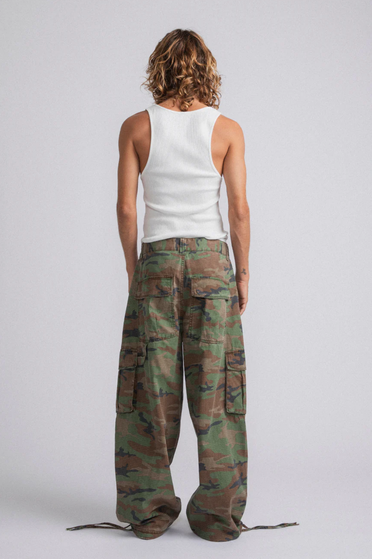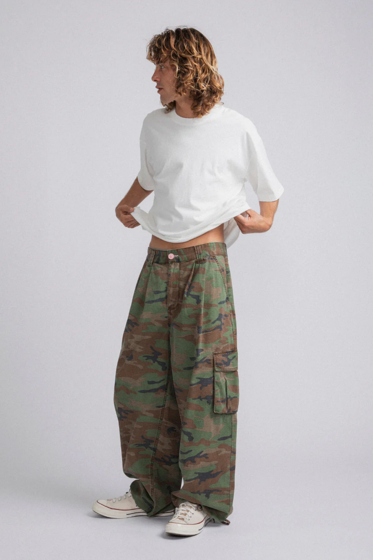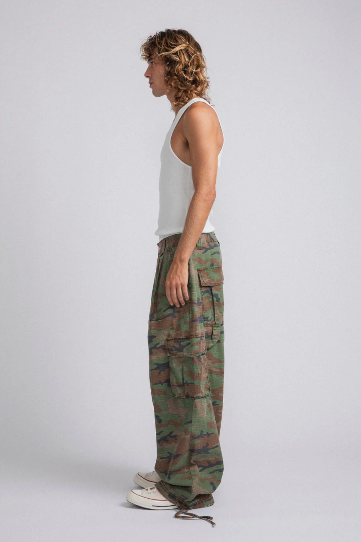 Relaxed fit, baggy through the leg with a clean straight drop. Made from washed cotton canvas with an allover camo print. Deep side pockets for everyday function, plus an adjustable drawcord at the hem.
