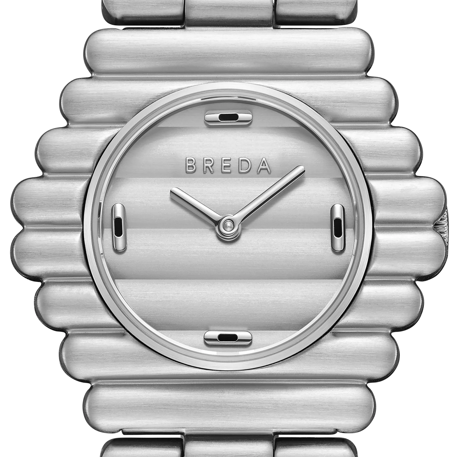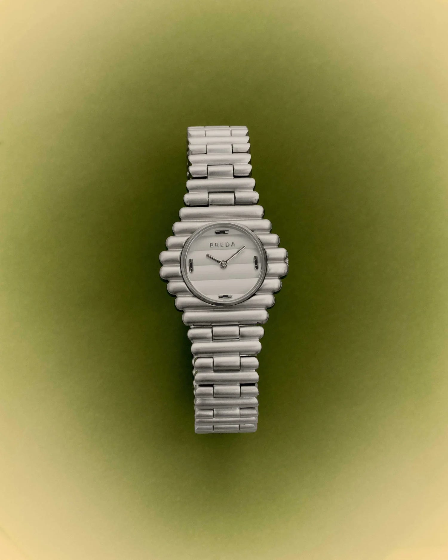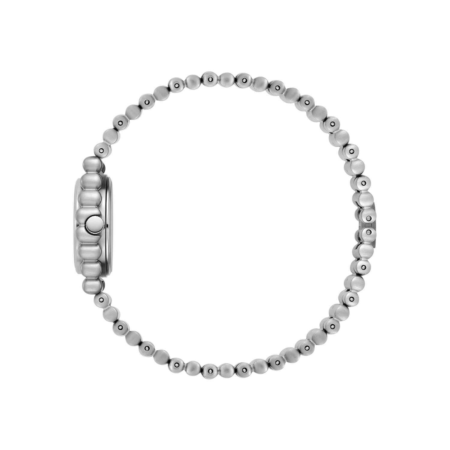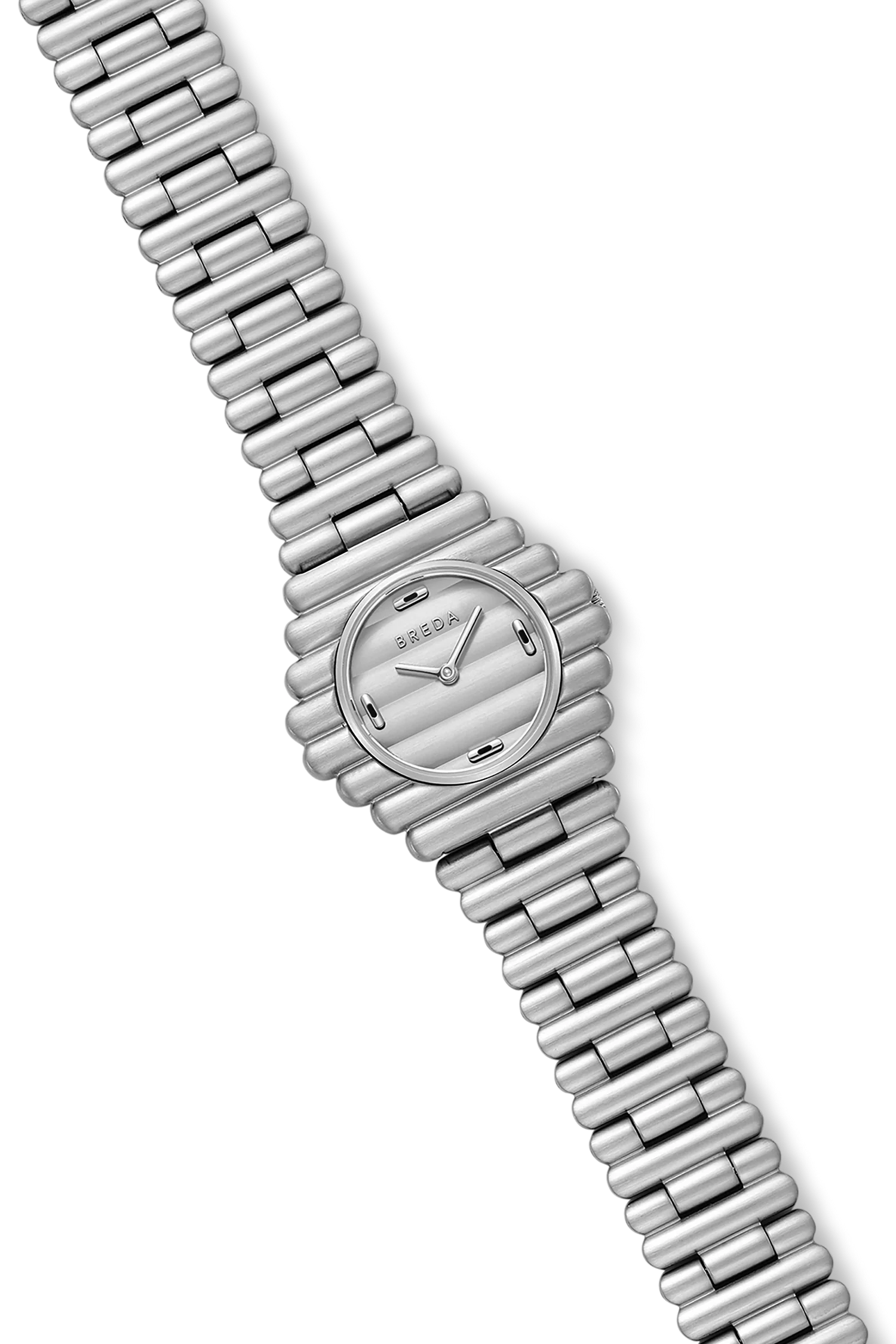 The Coda in Silver celebrates closure as an act of growth. With a silhouette composed of continuous curvature, made stainless steel, that tapers from the 32mm case to the 19mm bracelet, Coda carries a sense of harmony with time. The uninterrupted capsule shape design featured seamlessly through the timepiece creates a subtle yet striking profile around the wrist and fastens with a jewelry clasp. The dial includes subtly placed black enamel hour markers at cardinal points.