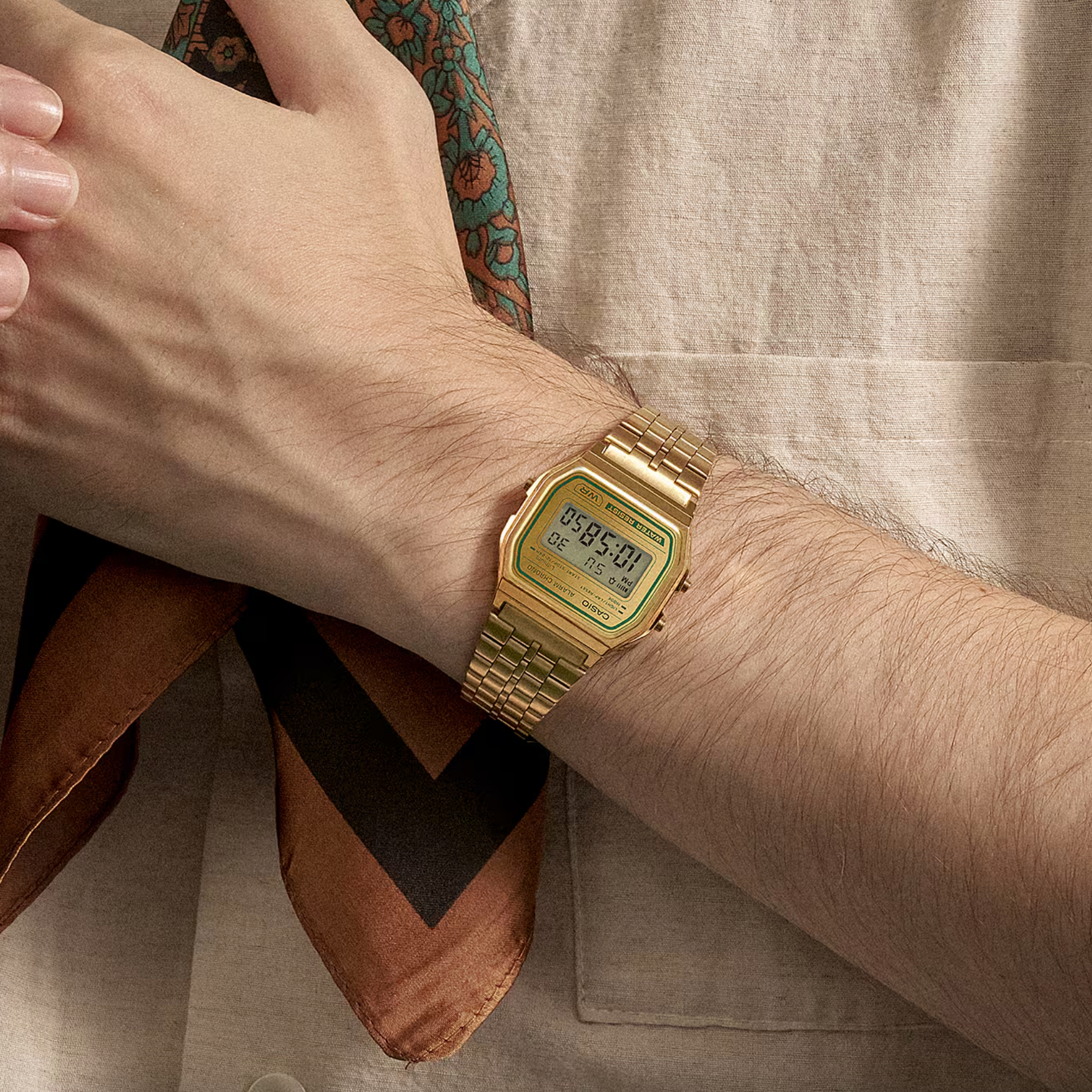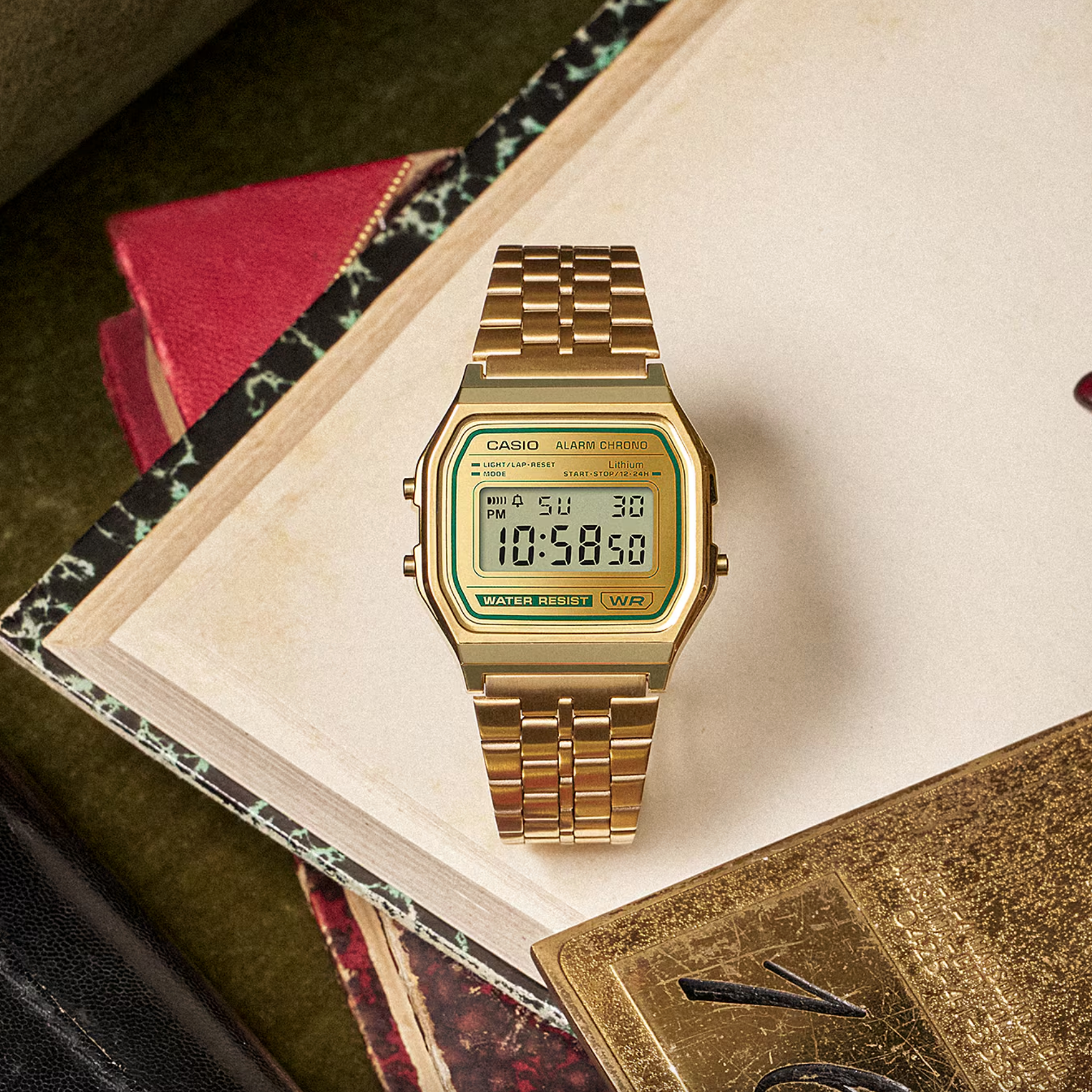 Charmingly classic with an eye-catching gold and green color scheme. The ever-popular A158 takes on green accents against a gold base — a timeless, yet contemporary unisex design. The multi-row metal bracelet band is given a matte finish and paired with a vapor-deposited watch glass for an added gorgeous glow. Not just beautiful, but practical, too. Enjoy handy functions like LED backlight, stopwatch, alarm, and more.