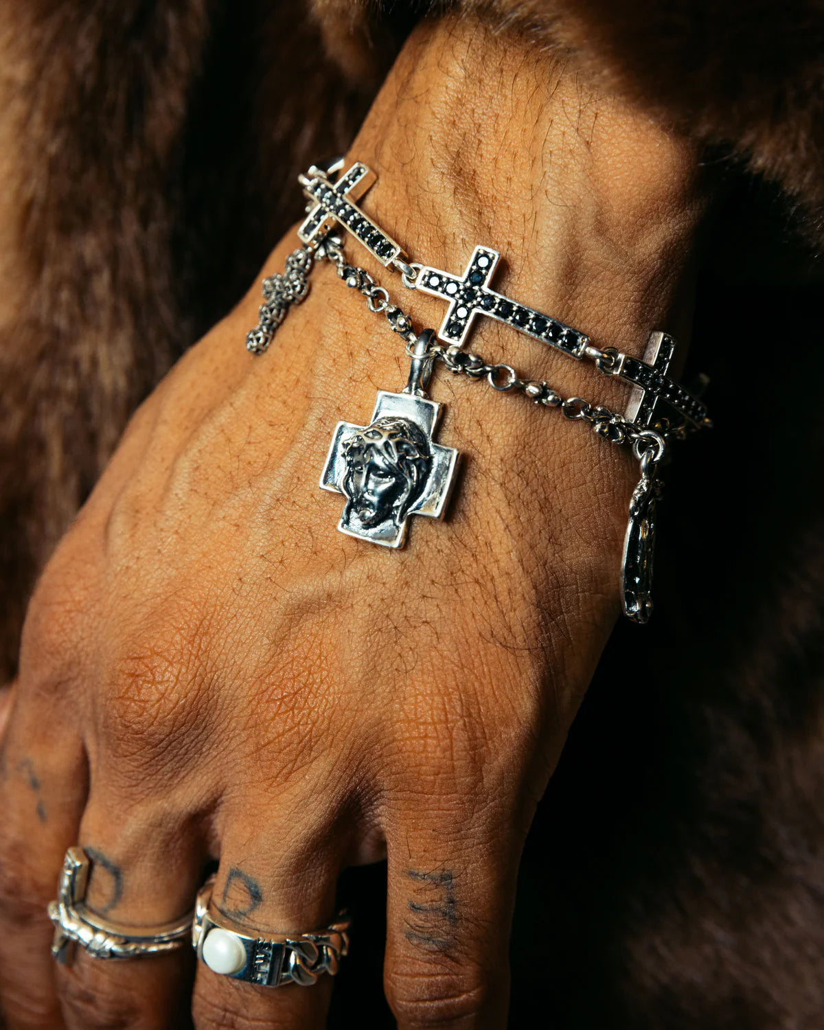 The Resurrection Charm Bracelet is a striking blend of craftsmanship and symbolism, designed to make a statement. Crafted from solid 925 sterling silver, it features five intricately detailed charms, each telling its own story. One standout piece is a hand-cut and shaped onyx stone, housed in a sterling silver frame, adding a bold contrast to the design. Adjustable from 7.25" to 8", this bracelet ensures a perfect fit for any wrist. Built to stand the test of time, the Resurrection Charm Bracelet is more than an accessory, it’s a legacy heirloom.