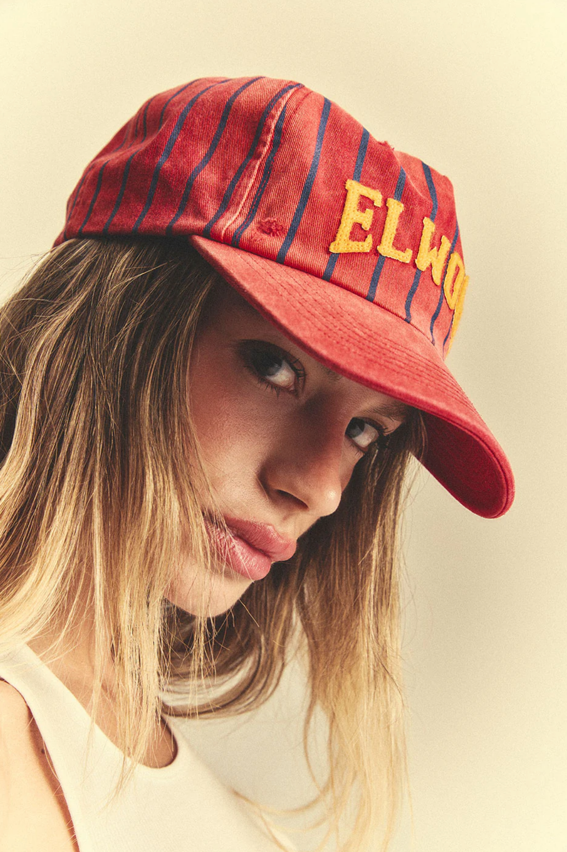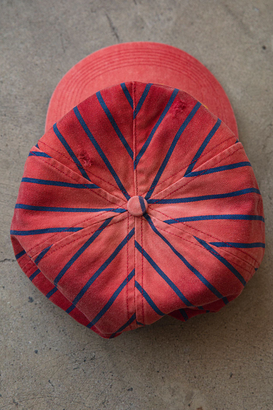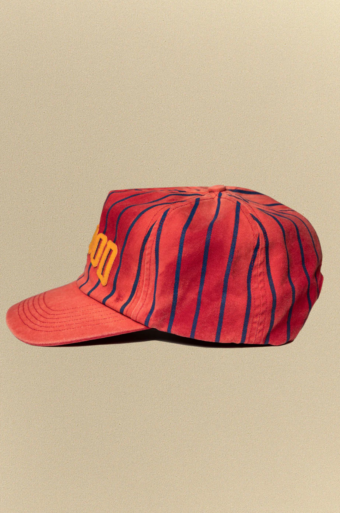 A pinstripe, vintage wash sports cap with a contrast marigold Elwood felt appliqué and distressed finish.