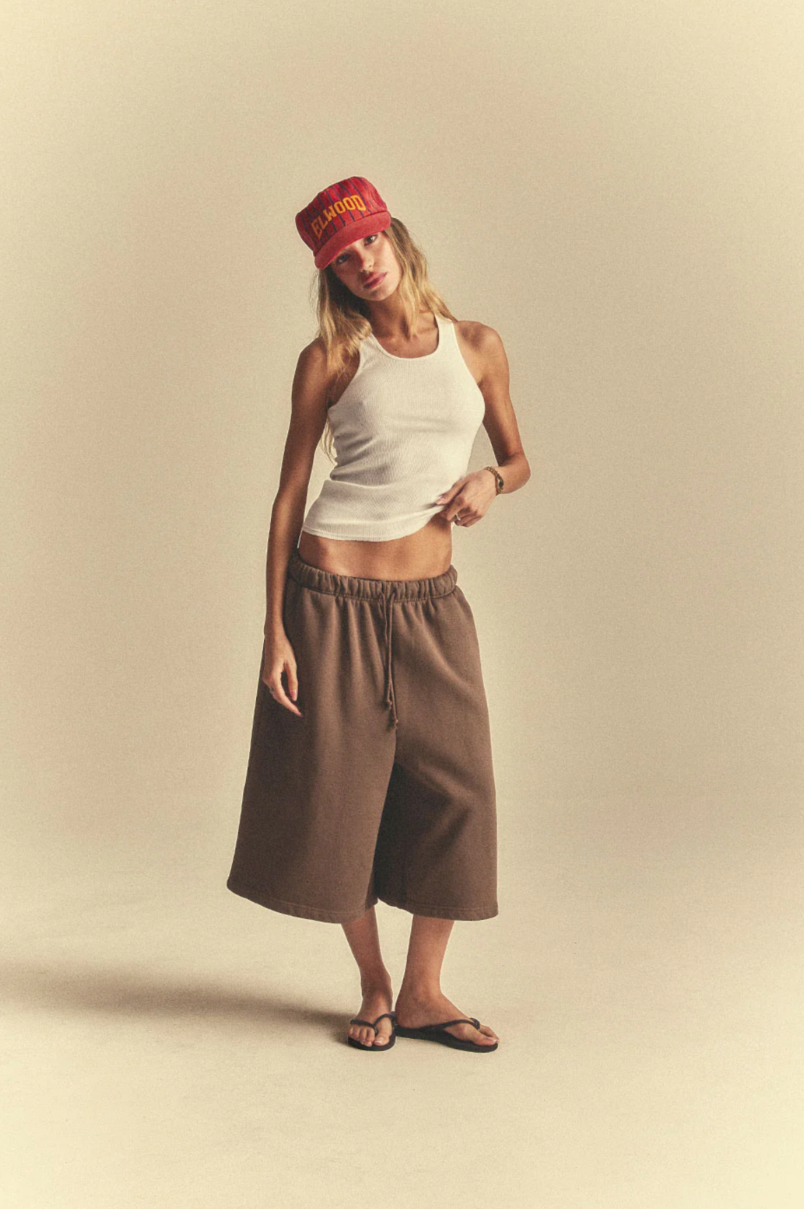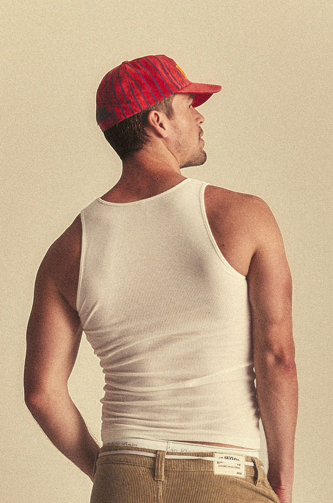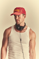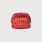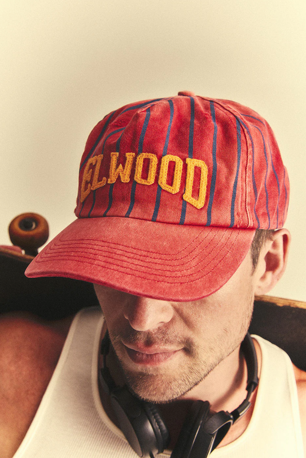 A pinstripe, vintage wash sports cap with a contrast marigold Elwood felt appliqué and distressed finish.