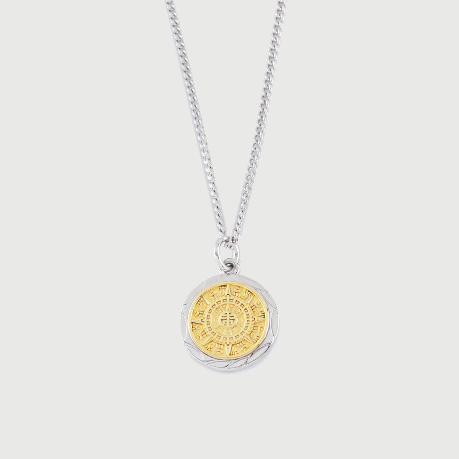 The Compass Necklace is a classic round shape pendant with a decorative compass on the face in an Aztec style with a detailed dial and 4 directional points. The pendant is 17mm in diameter and hangs from a slim 1.5mm curb chain which can be adjusted from 46cm up to 52cm.
