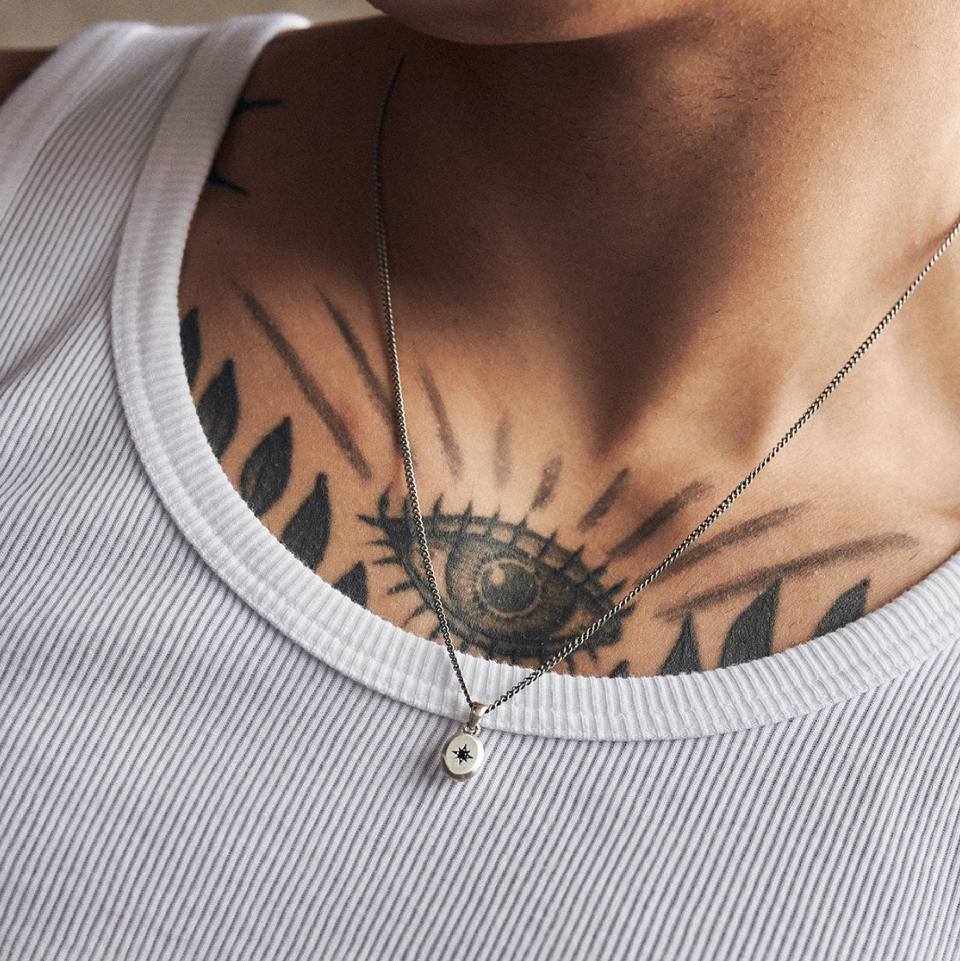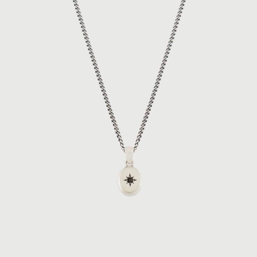 The Silver Polaris Necklace is a minimal necklace with a small oval pendant and black Cubic Zirconia stone. The necklace is made from 925 Sterling Silver, and is hallmarked verifying its quality.
