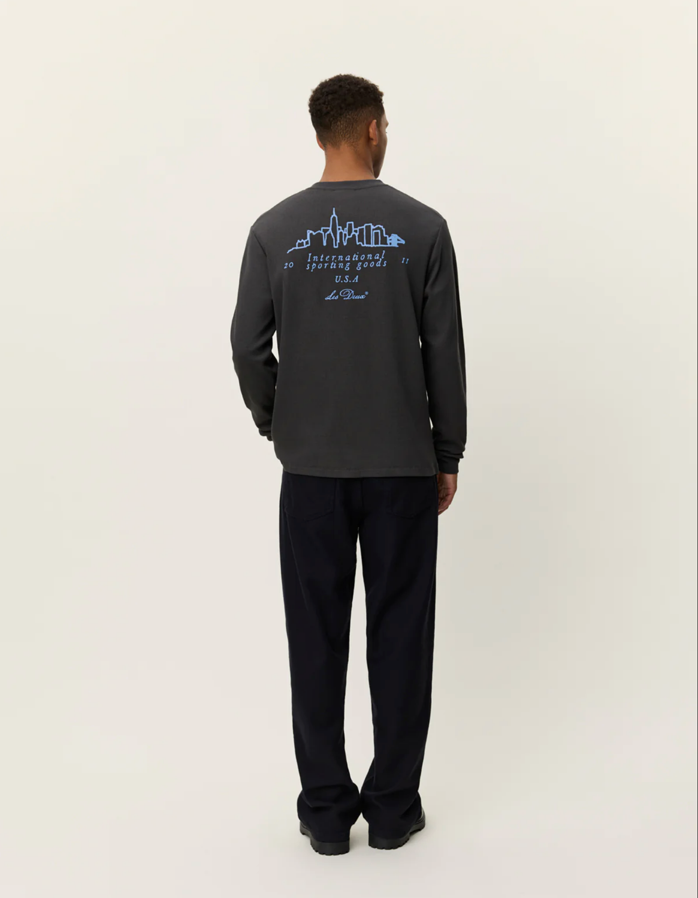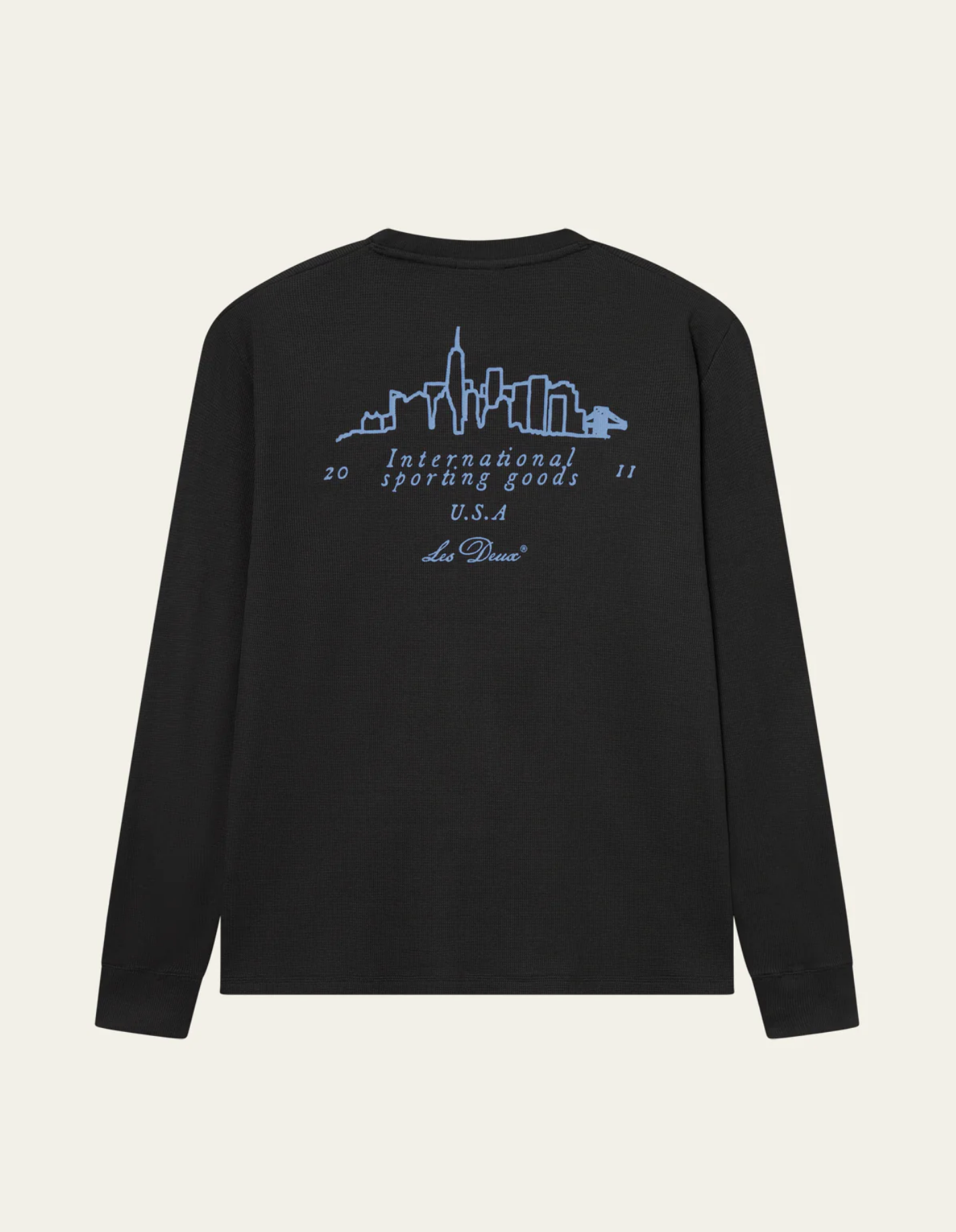 A long-sleeve tee in waffle-textured organic cotton with a touch of stretch. Features a small chest print and a large skyline graphic on the back in contrast color.