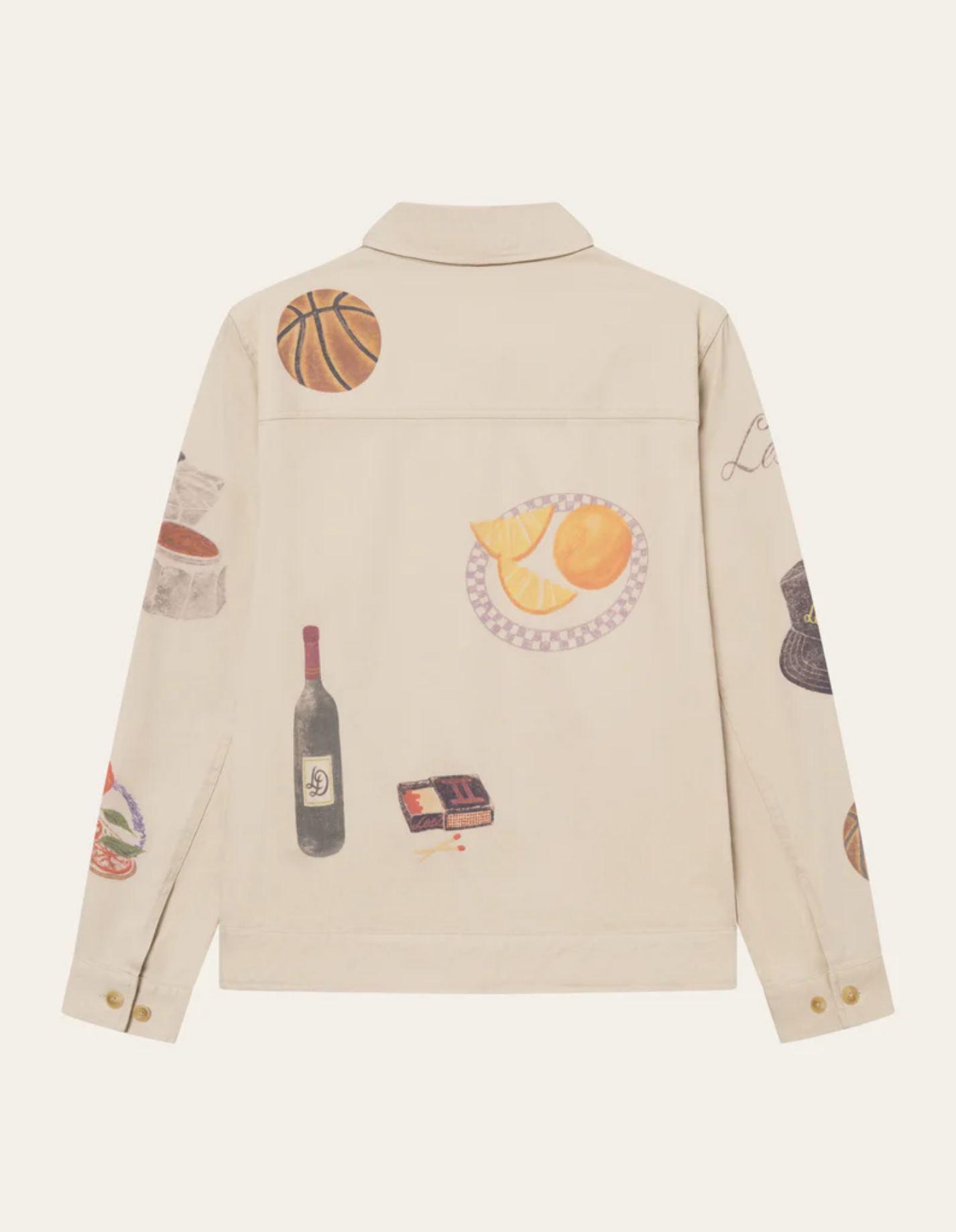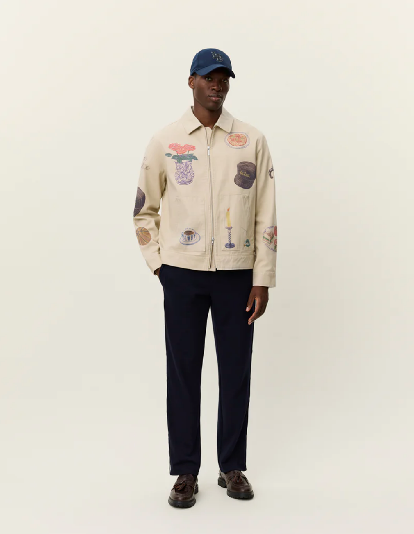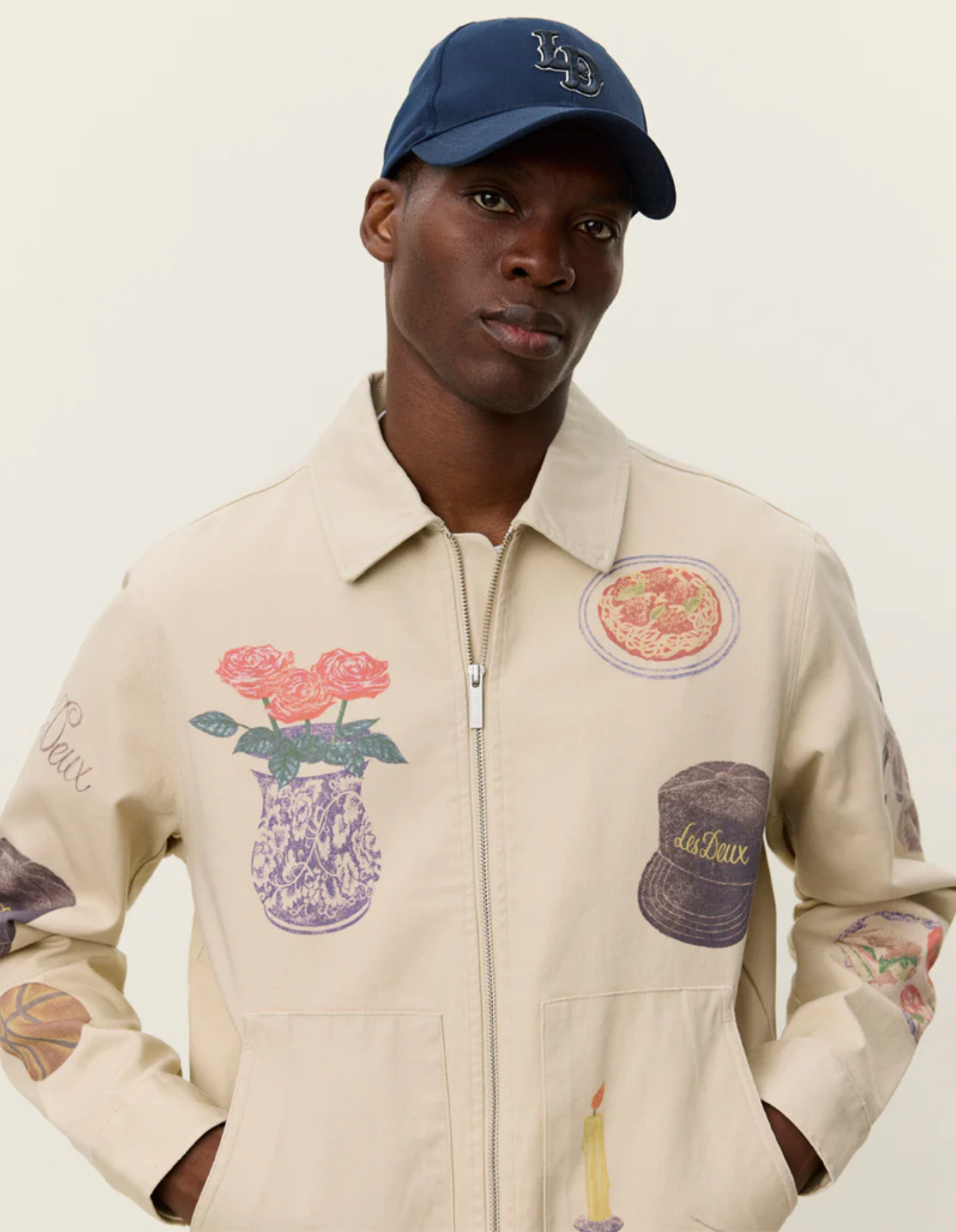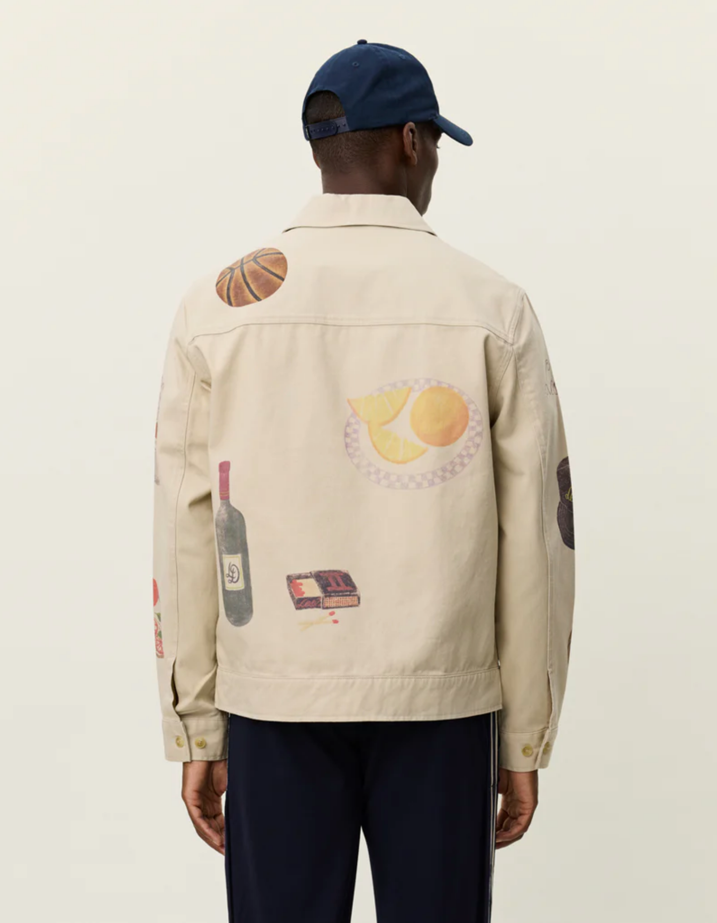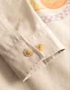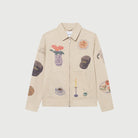 A short-cut jacket in sturdy cotton canvas with all-over printed artwork. Designed with a two-way zip front, kangaroo pocket, and adjustable button cuffs.