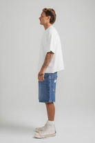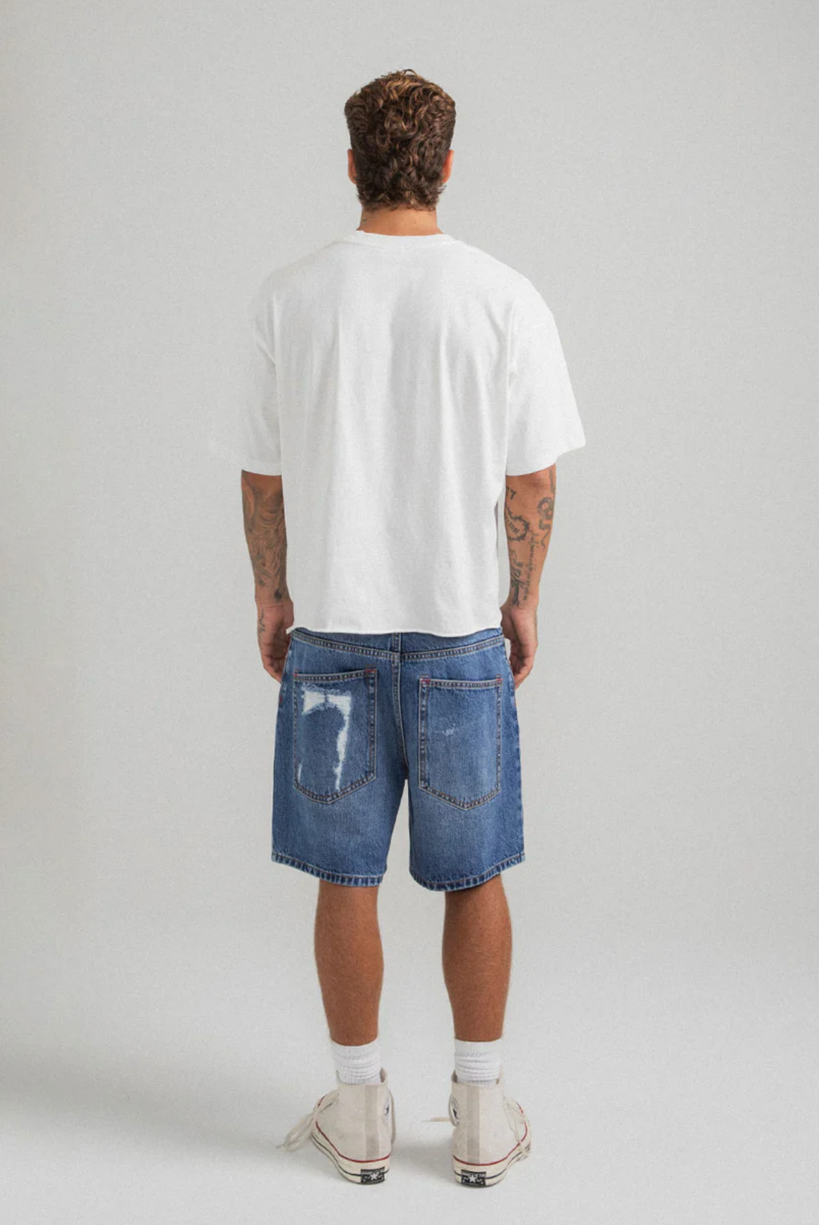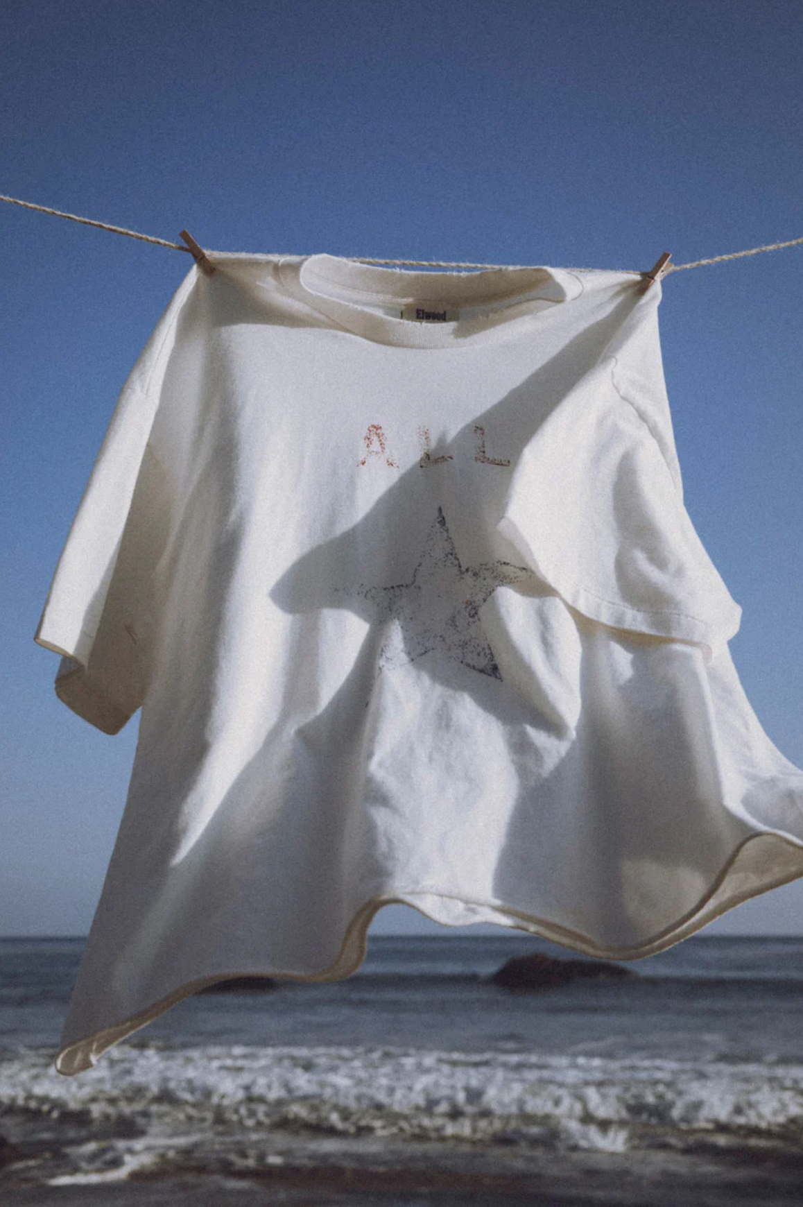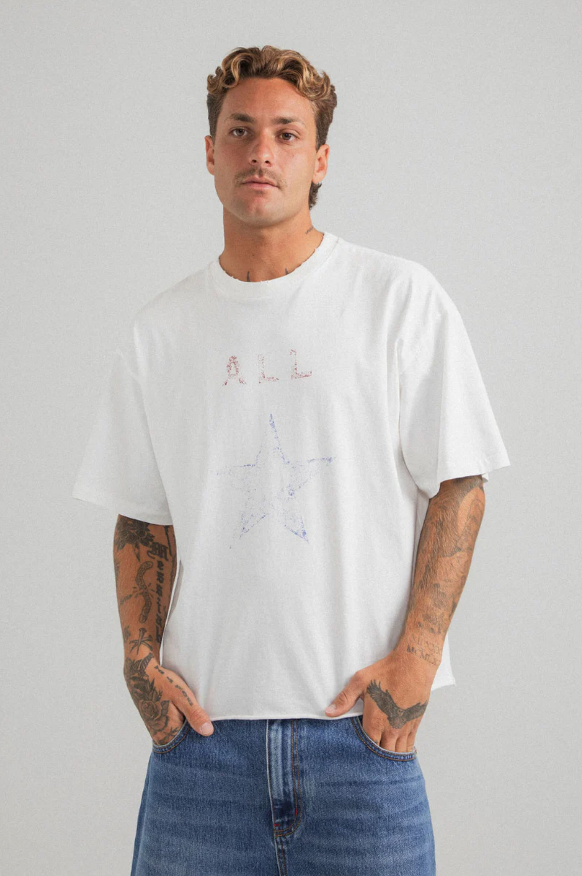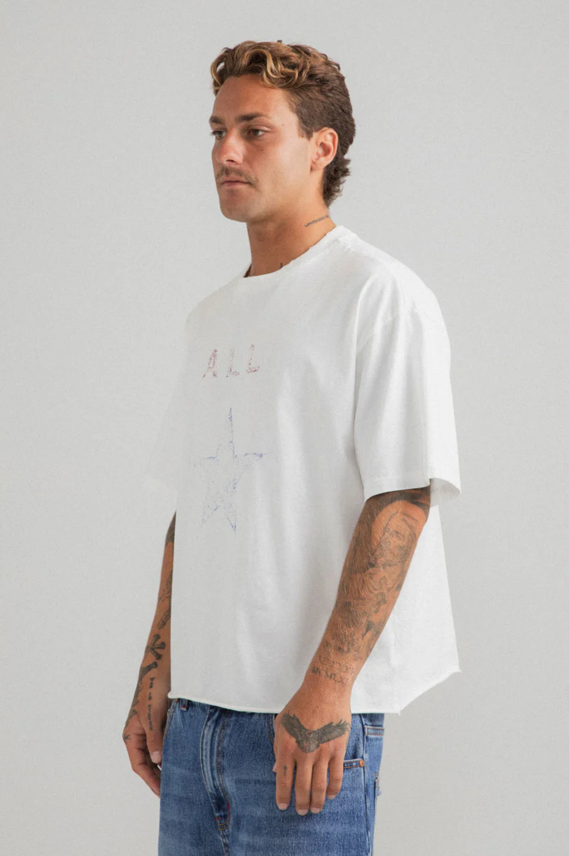 This classic Oversized Cropped Core Tee features a faded red “All” screenprint and a blue star graphic on a sun-bleached white base. Inspired by your favorite vintage tee, it’s made to pair effortlessly with denim cutoffs and long summer days.