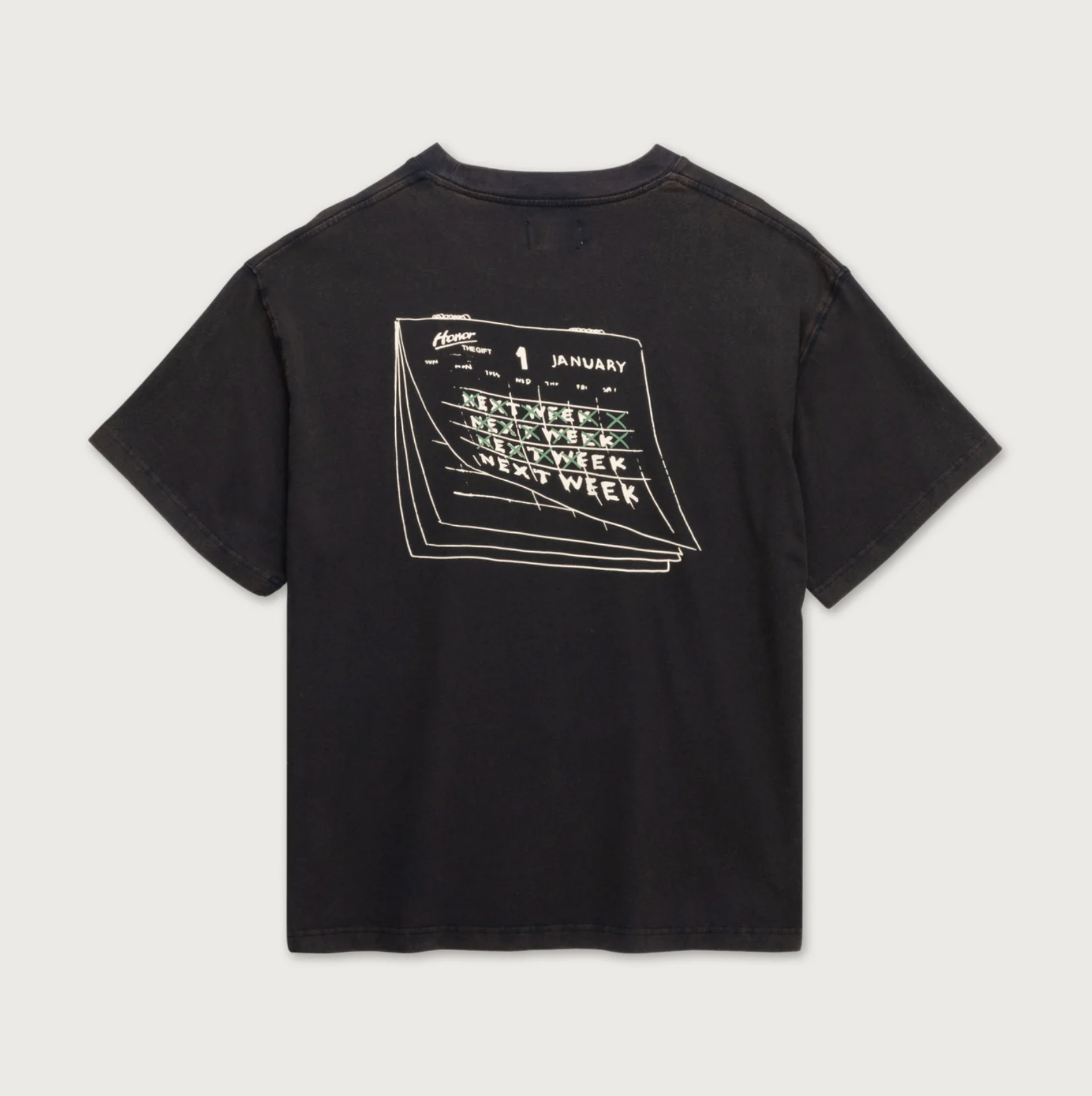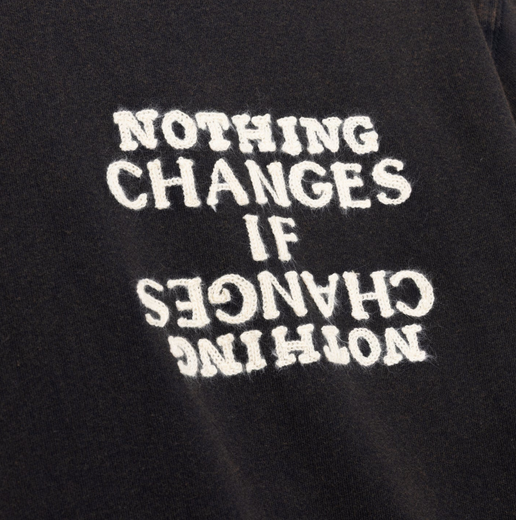 NOTHING CHANGES TEE—a 100% cotton tee in faded black with a vintage wash. The front features the embroidered message "NOTHING CHANGES IF NOTHING CHANGES," and the back displays a hand-drawn calendar graphic. Relaxed fit for everyday wear.