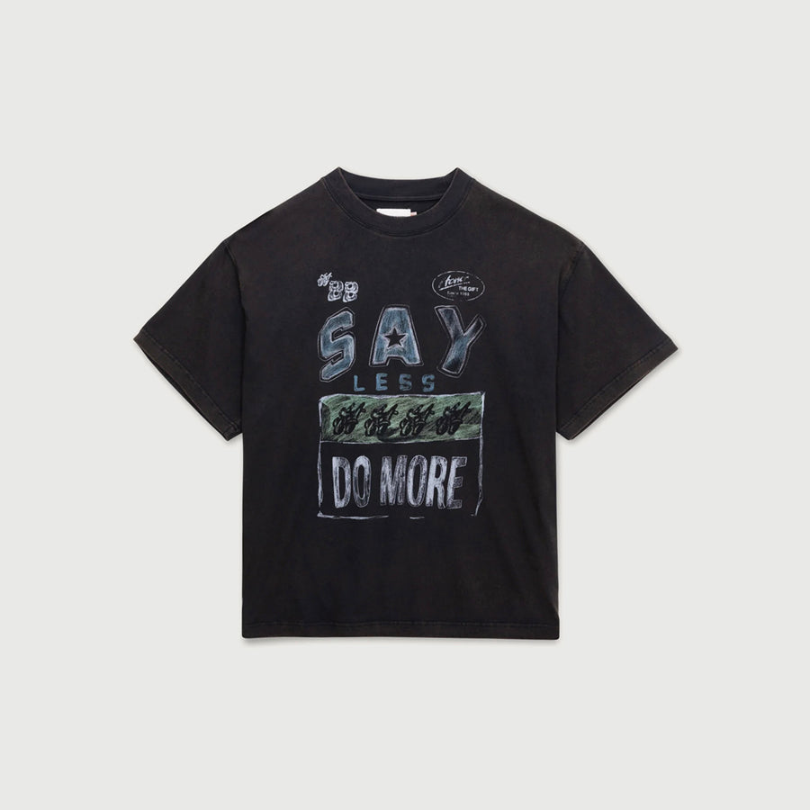 Say Less Do More Tee, crafted from 100% cotton for all-day comfort. Designed with a relaxed-fit, off-white t-shirt features a hand-drawn graphic across the chest with the phrase "SAY LESS DO MORE" in green and black. Along with the stylized "88" and "HONOR THE GIFT Since 1988" details.