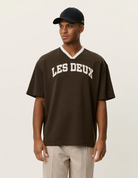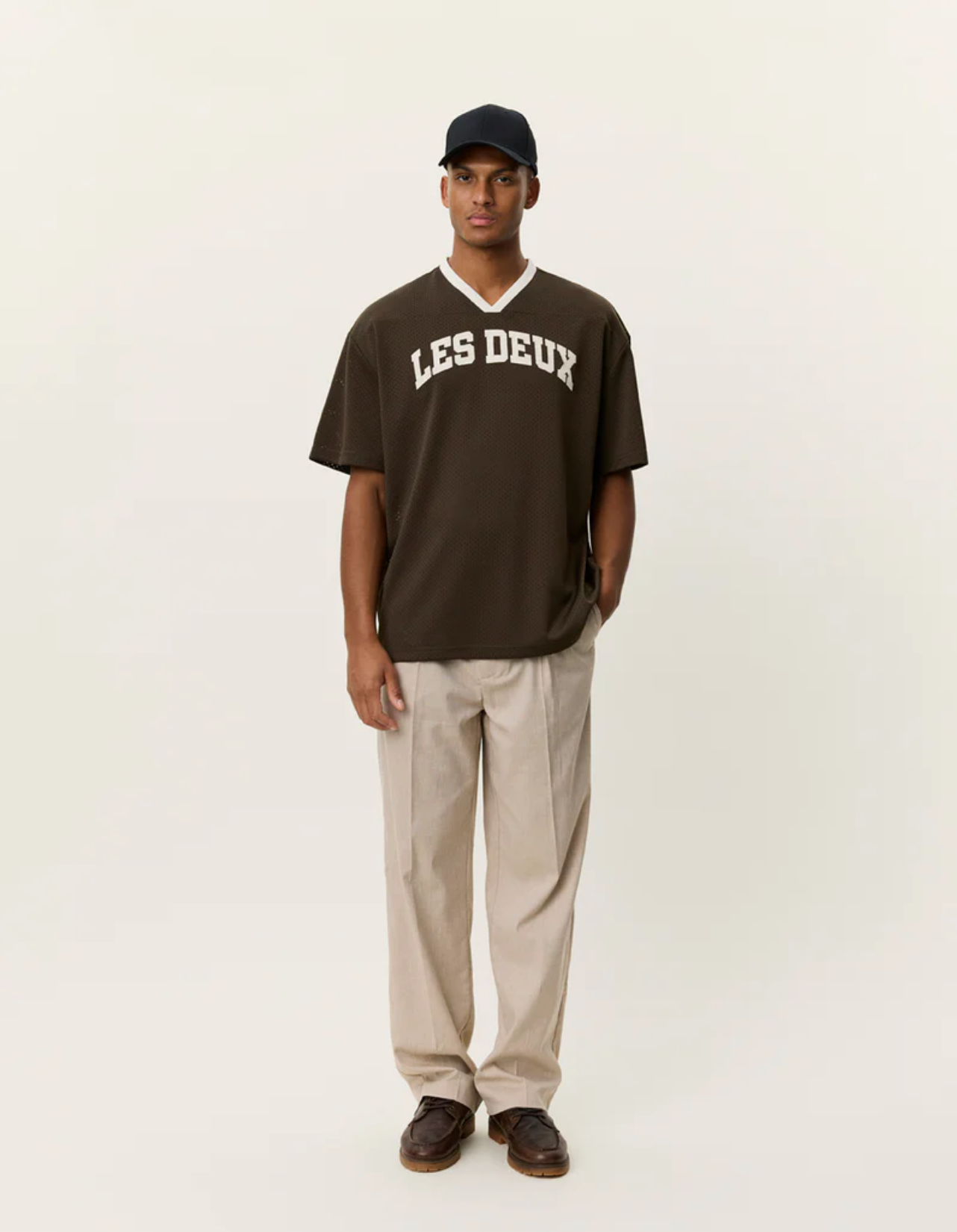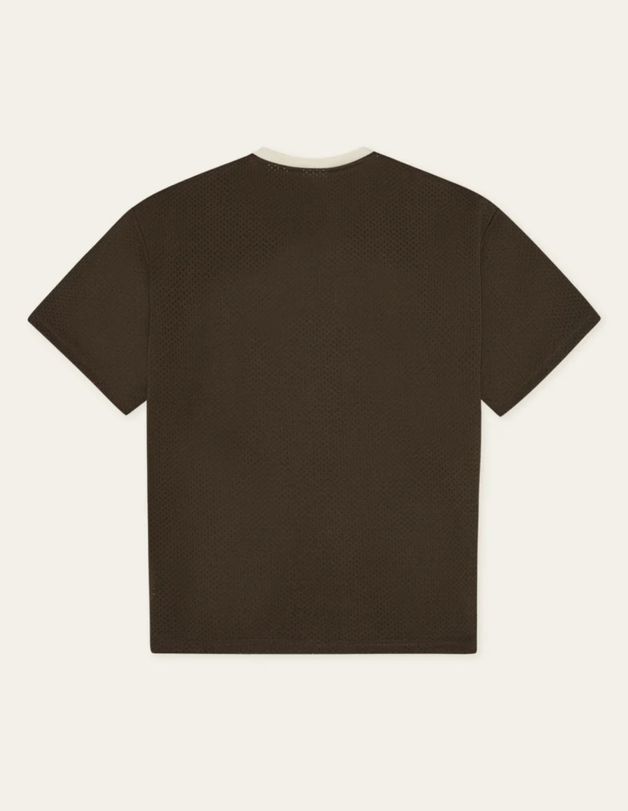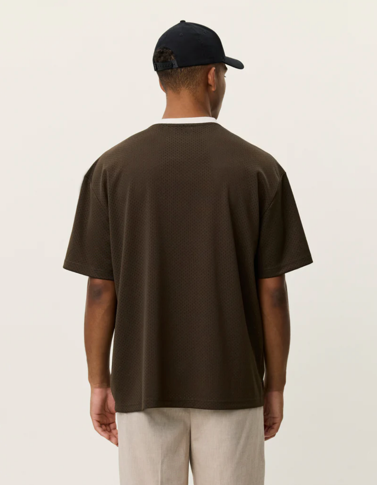 A basketball-inspired mesh tee with a relaxed, boxy silhouette. Made from recycled polyester with contrast neck tape and bold chest patches for a collegiate feel.