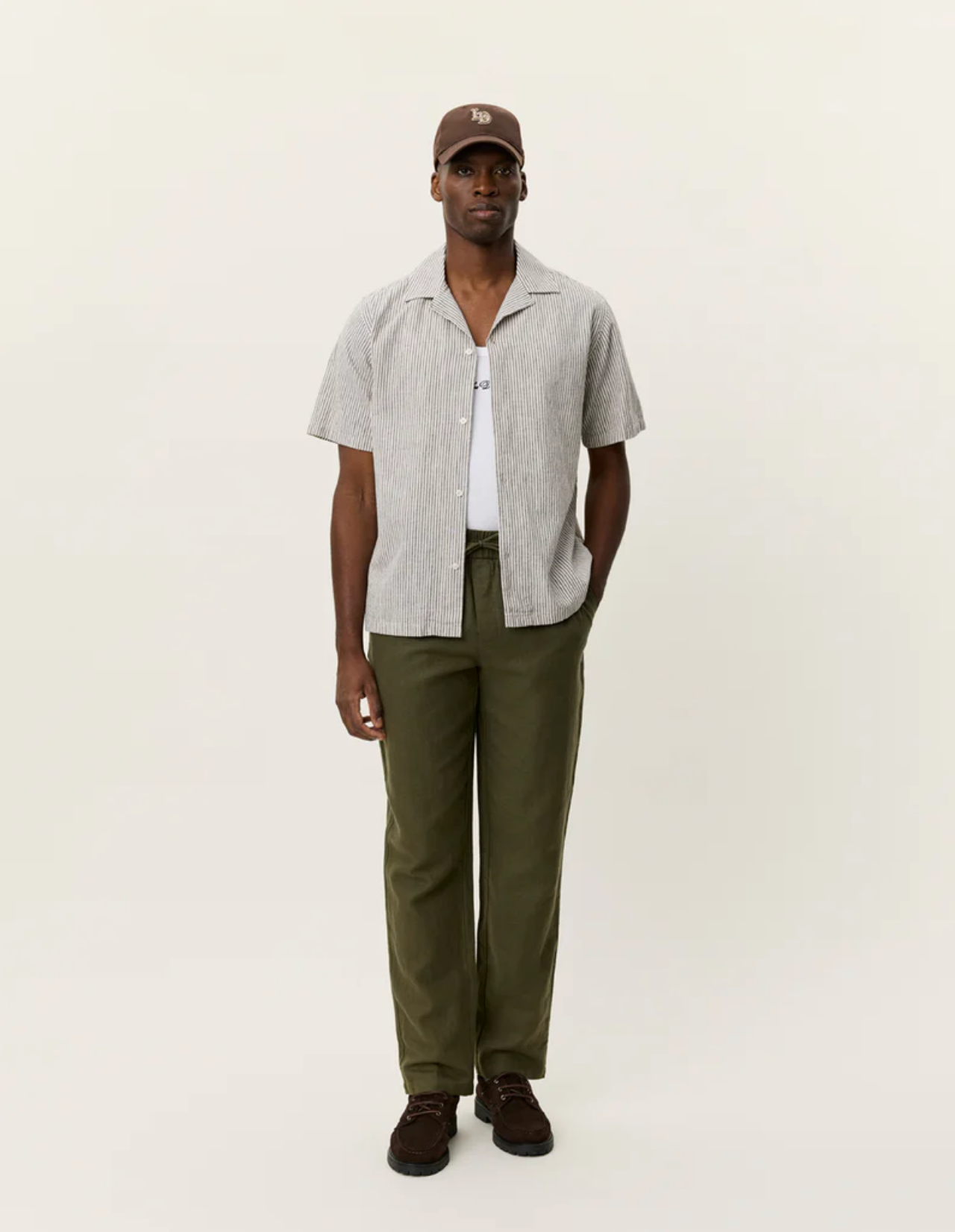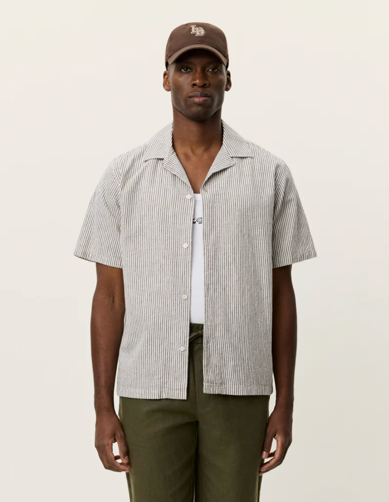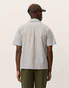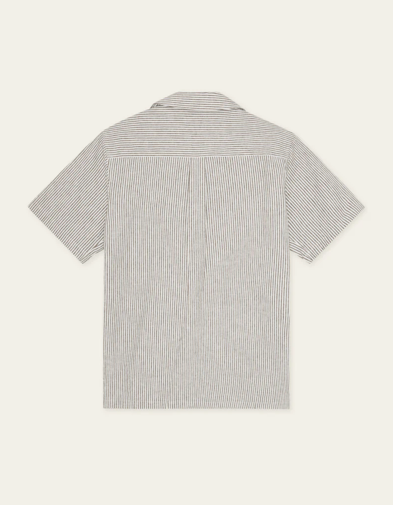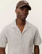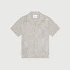 A lightweight short sleeve shirt in a breathable cotton–linen blend with a classic vertical stripe. Finished with a relaxed camp collar and a clean, easy drape.