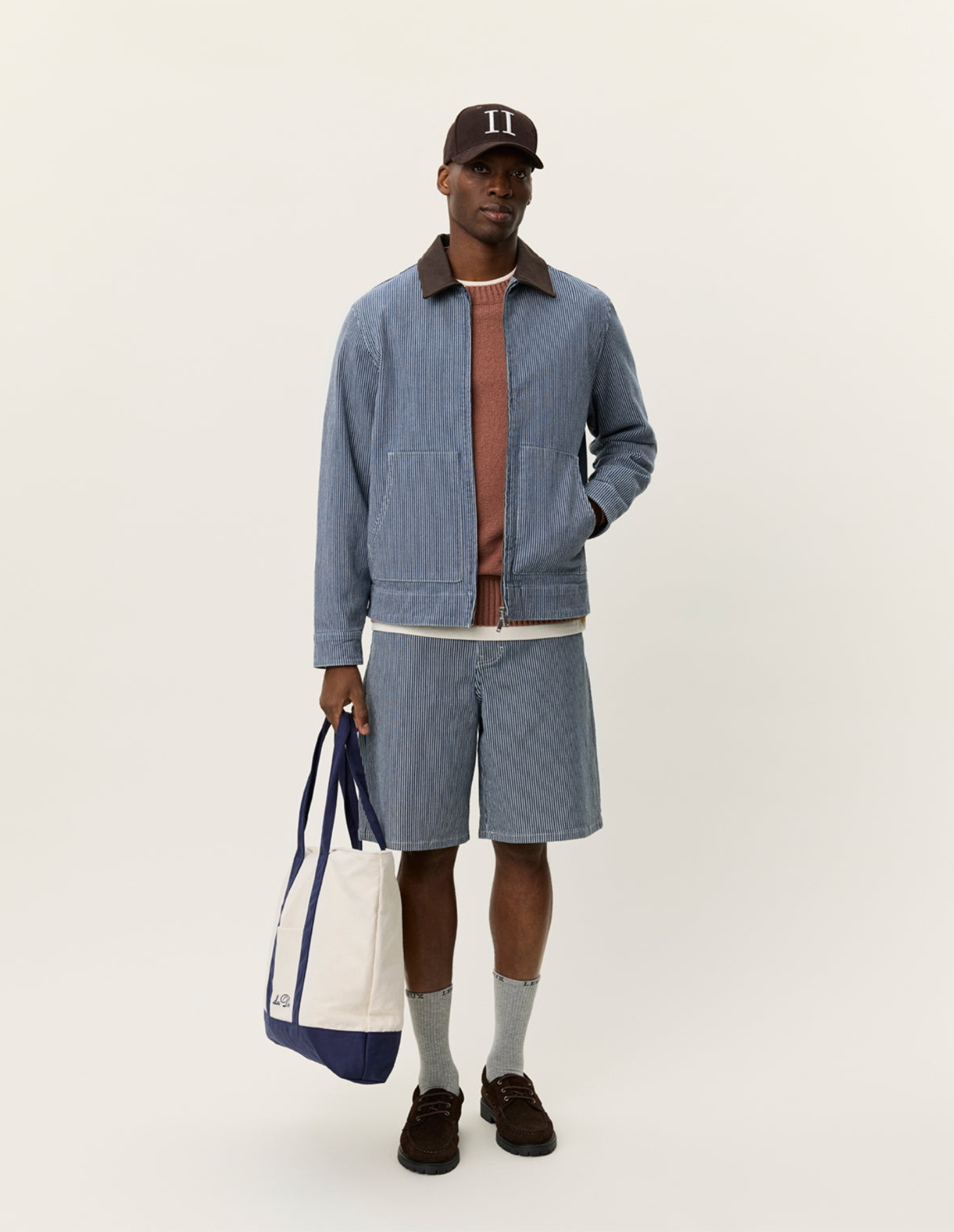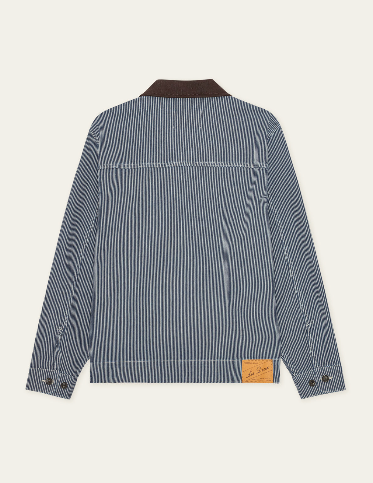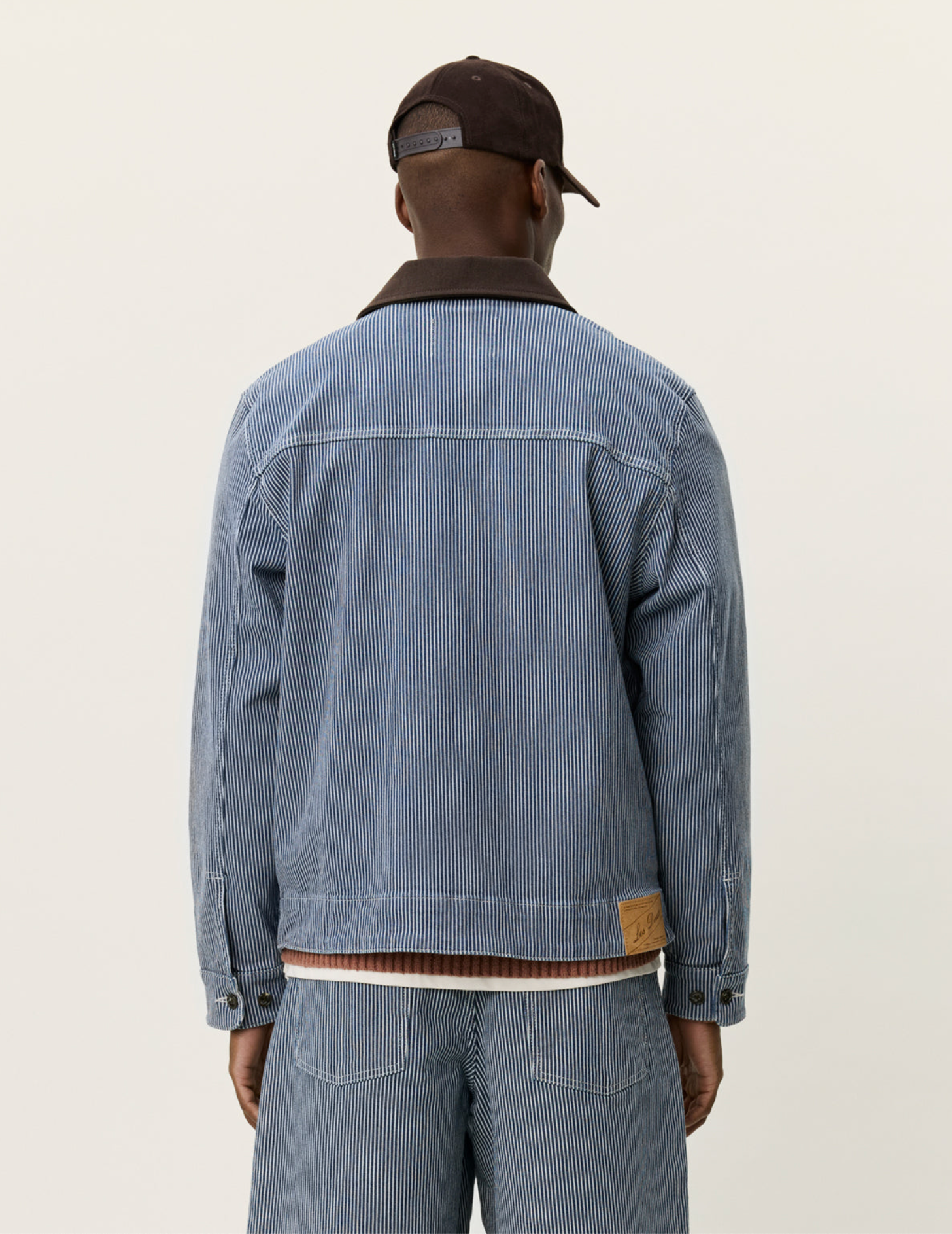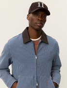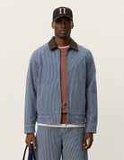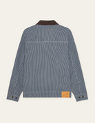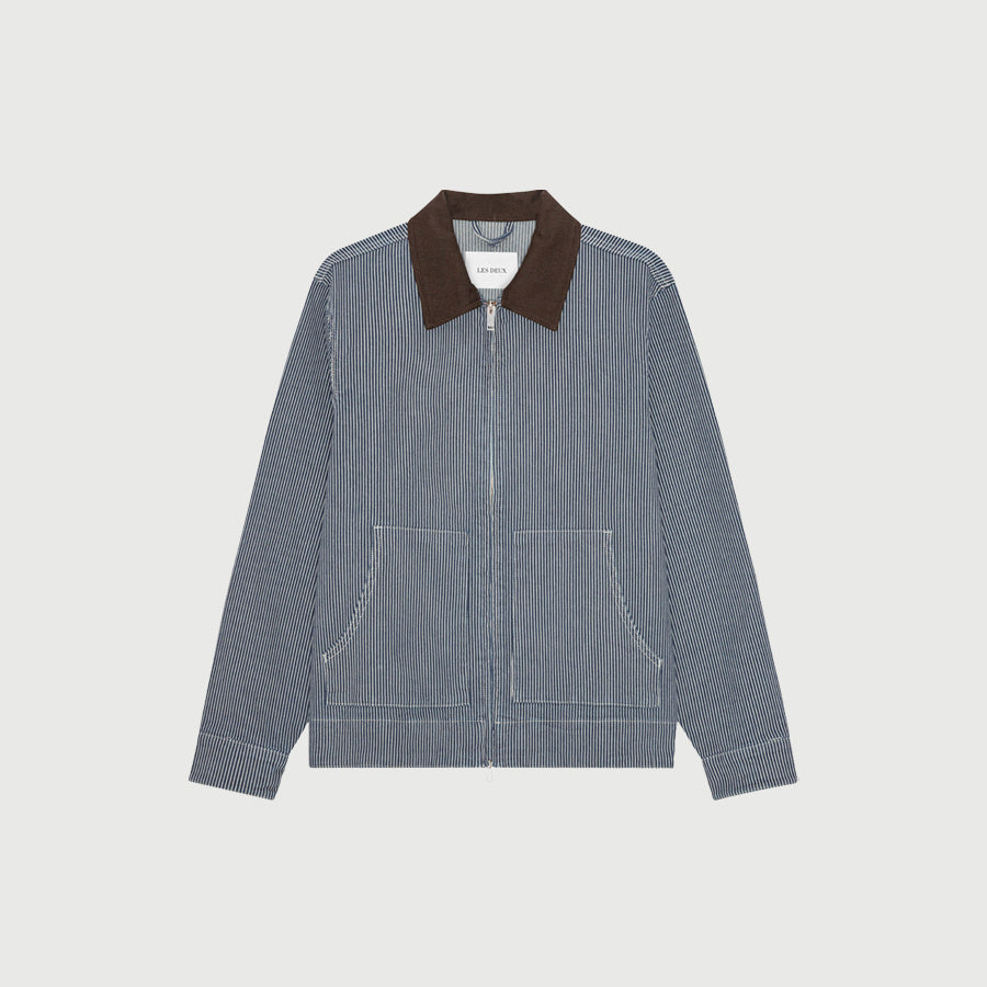 A short striped denim jacket with a clean workwear feel. It features kangaroo pockets, a contrast twill collar and a 2 way zipper for easy layering.