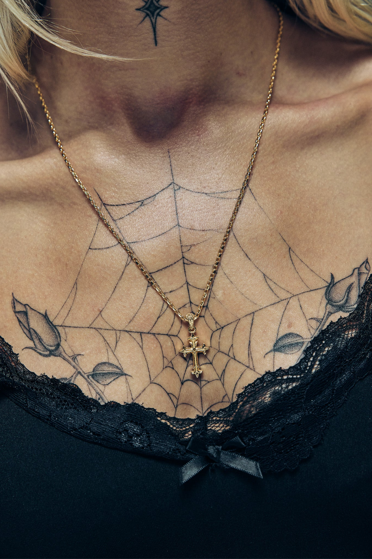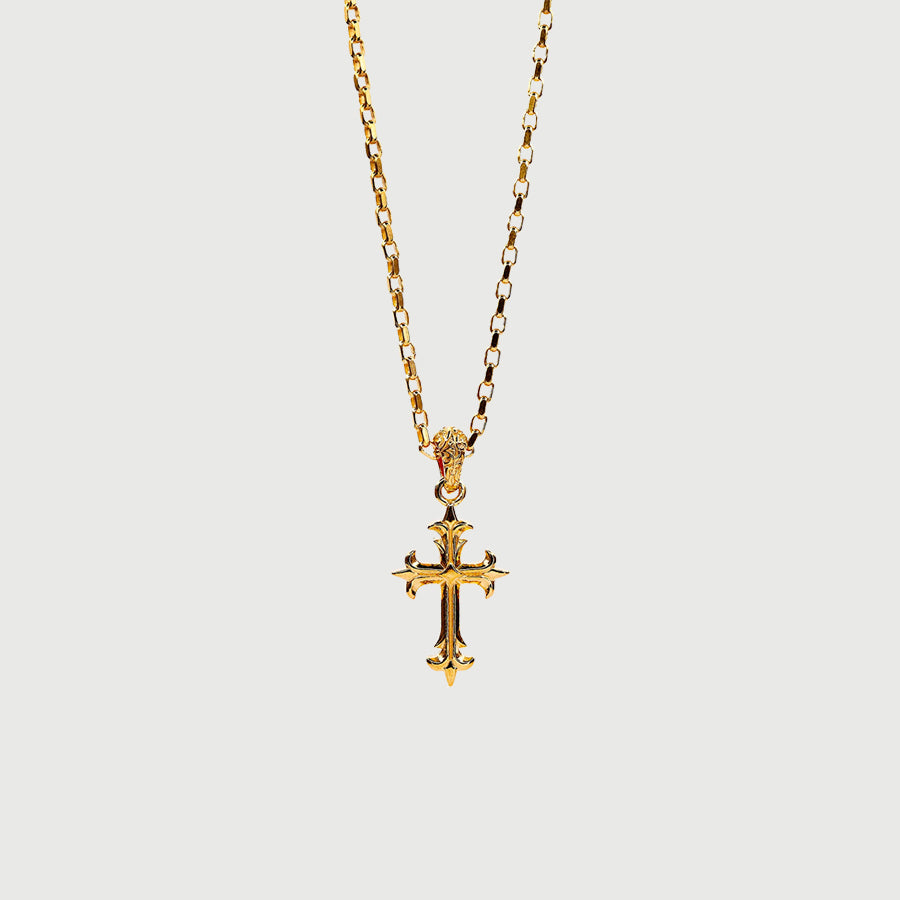 The Small Gothic Cross Necklace design draws from gothic architecture and the fleur-de-lis, symbols of devotion, strength, and power.
