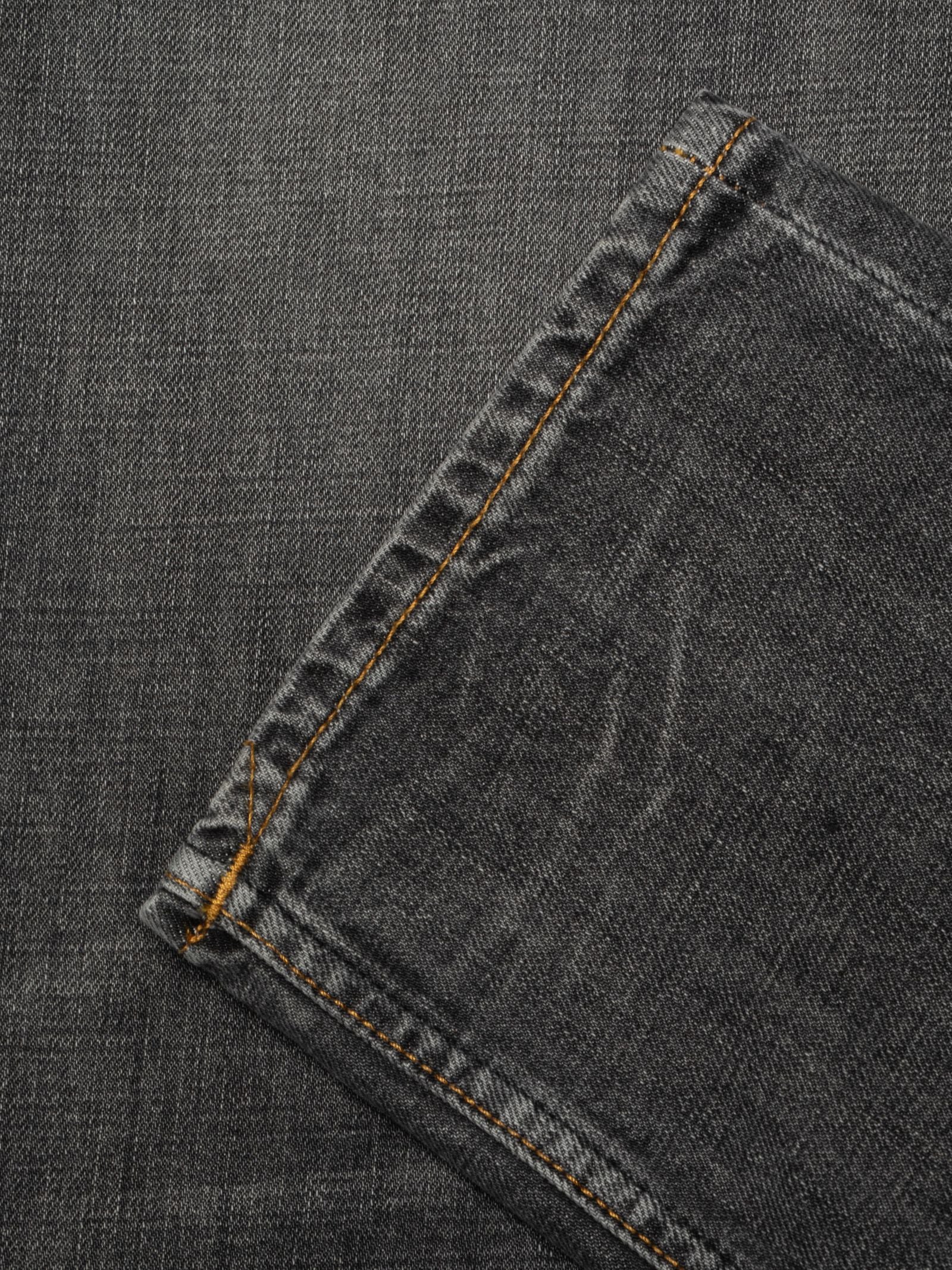 High-waist, regular-fit jeans with a straight leg, featuring a bold grey wash and contrasting details. Crafted from black denim with a rugged crosshatch texture, these jeans highlight rich highs and lows, accentuated by a pronounced slub character. Abrasions and sharp wear marks deepen their unique, bold, and monochromatic look.