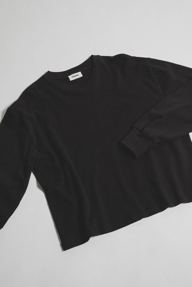 The 100% cotton jersey long sleeve features a heavier weight fabric for a soft, draped silhouette. Boxy fit and no distressing for a clean finish.