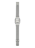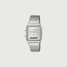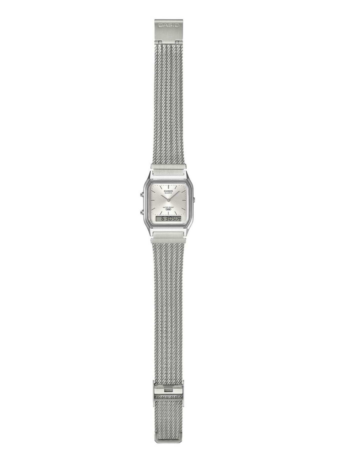 An updated take on a favorite classic — the analog-digital combination AQ-230 with angular face goes stylishly elegant with a fine-woven mesh band. Treated with a specialized pressing process that adds depth and dimension, the mesh band delivers a refined, vintage look and a totally comfortable fit for your wrist. Choose a dial in navy or a silver color to complement the silver-colored case. Updated with the mesh band, these classic designs make an even more striking style statement by highlighting the beauty of metal mesh, delivering a refined, elegant presence all their own.