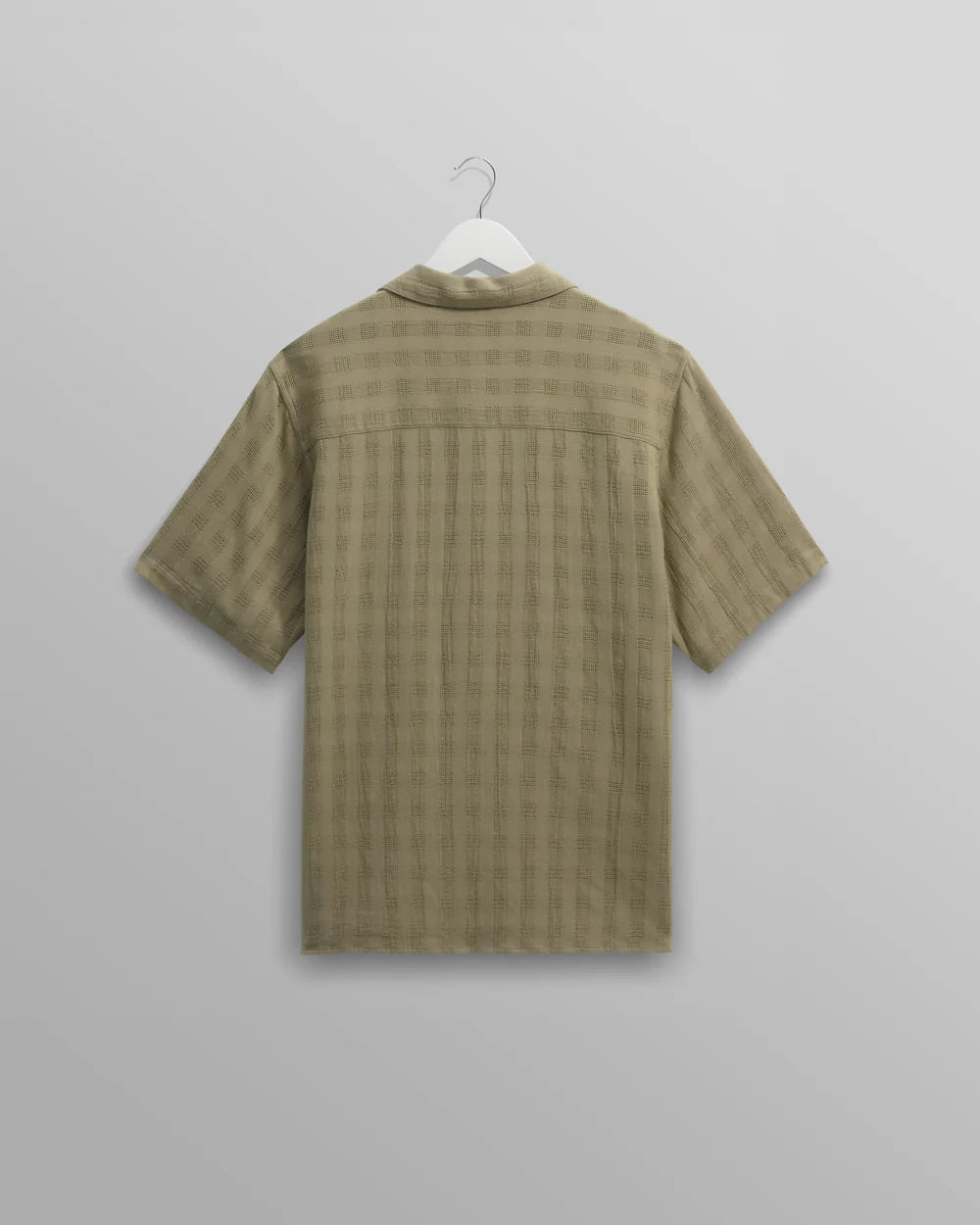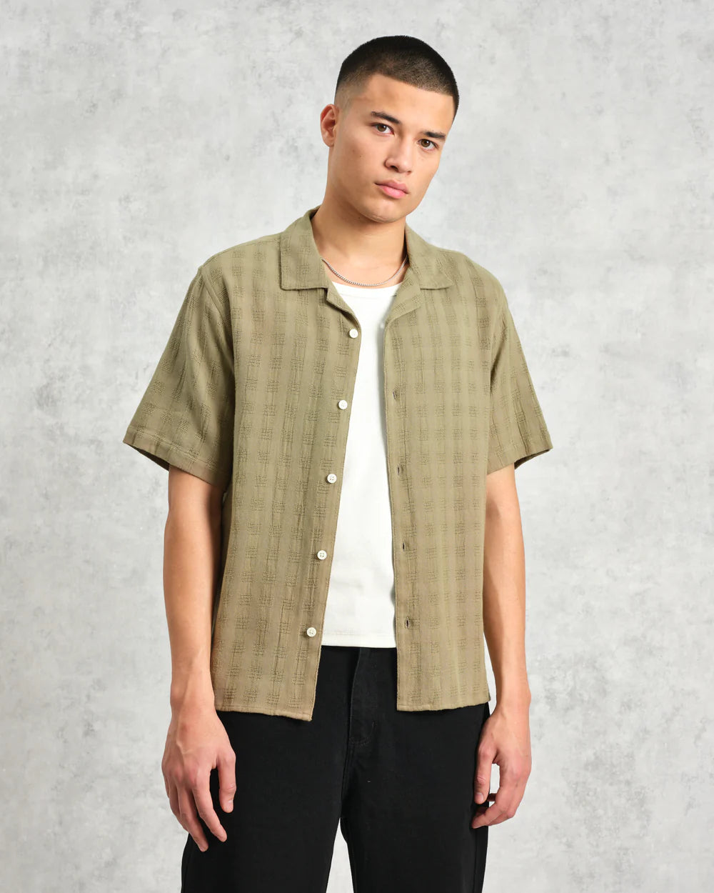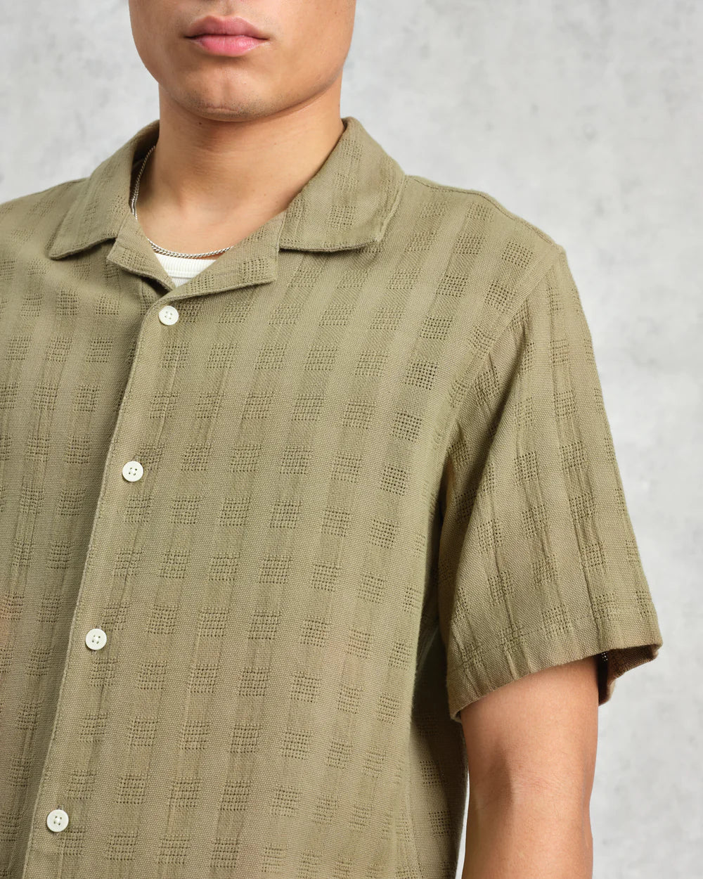 Our staple Didcot short-sleeve shirt makes a triumphant return for SS25. Cut for a relaxed, breezy fit, this khaki version is made from a 100% soft-washed cotton and showcases a square grid design with subtle holes within the squares.