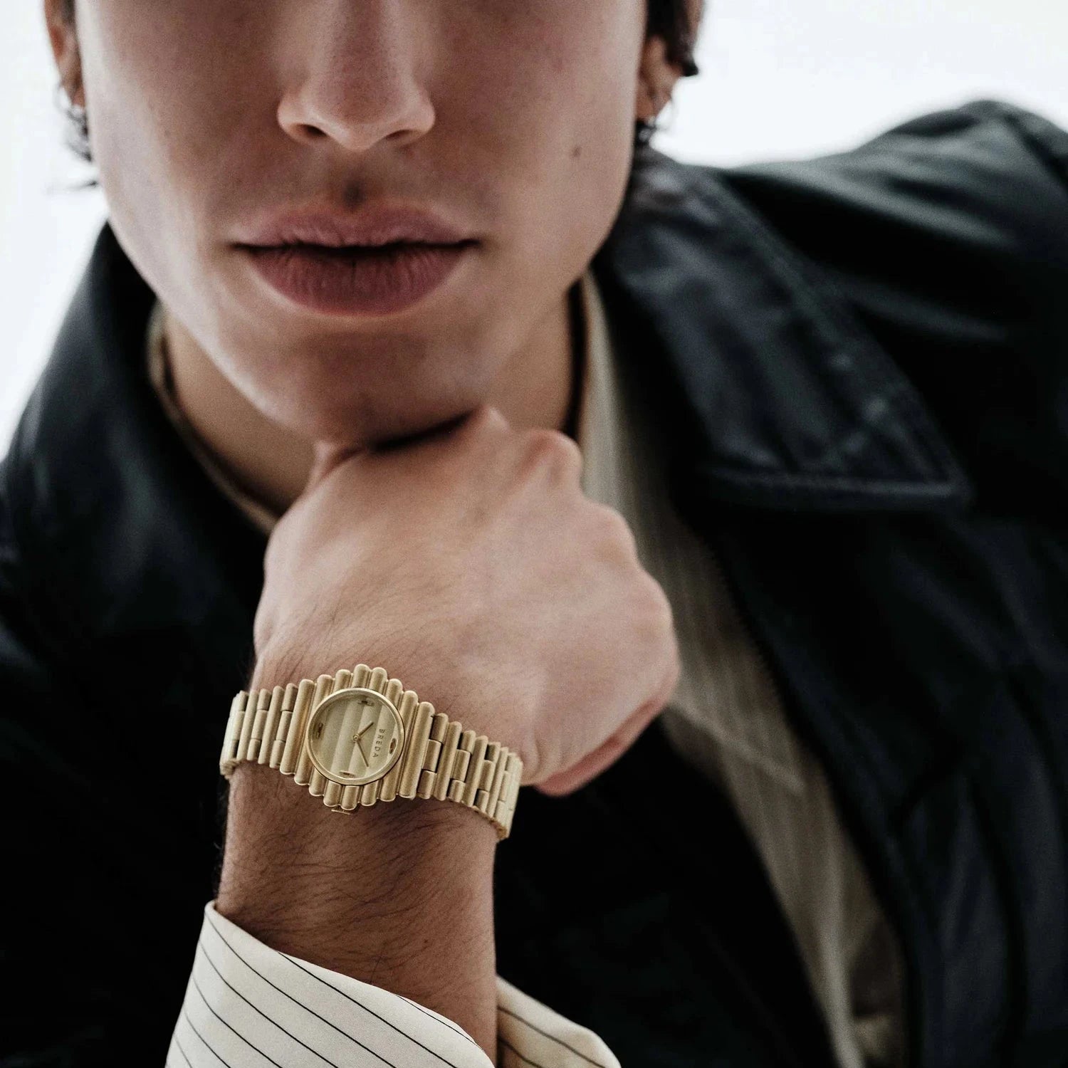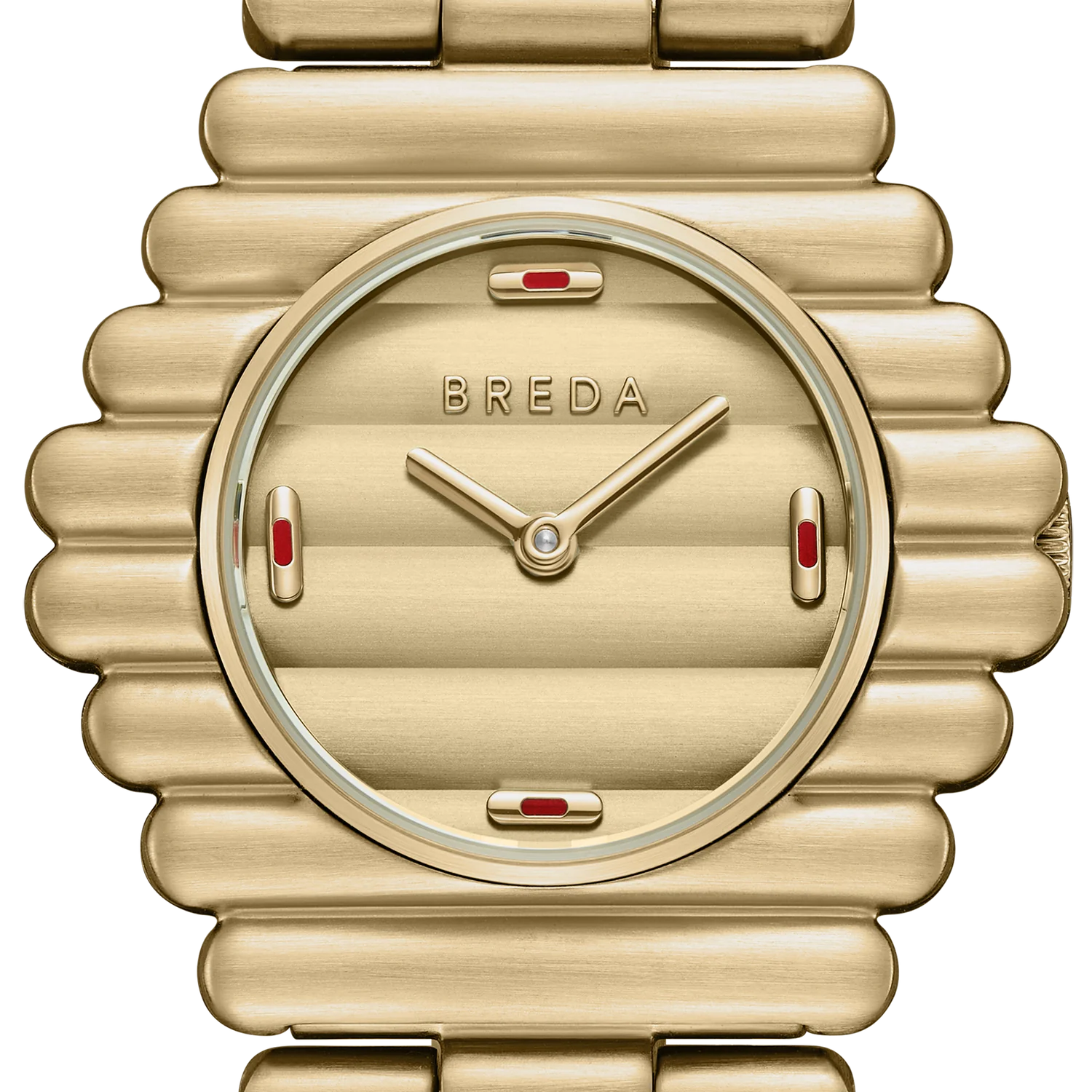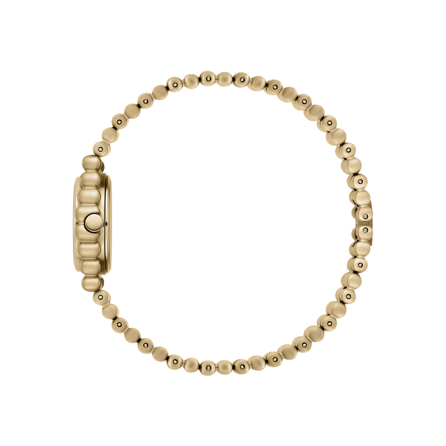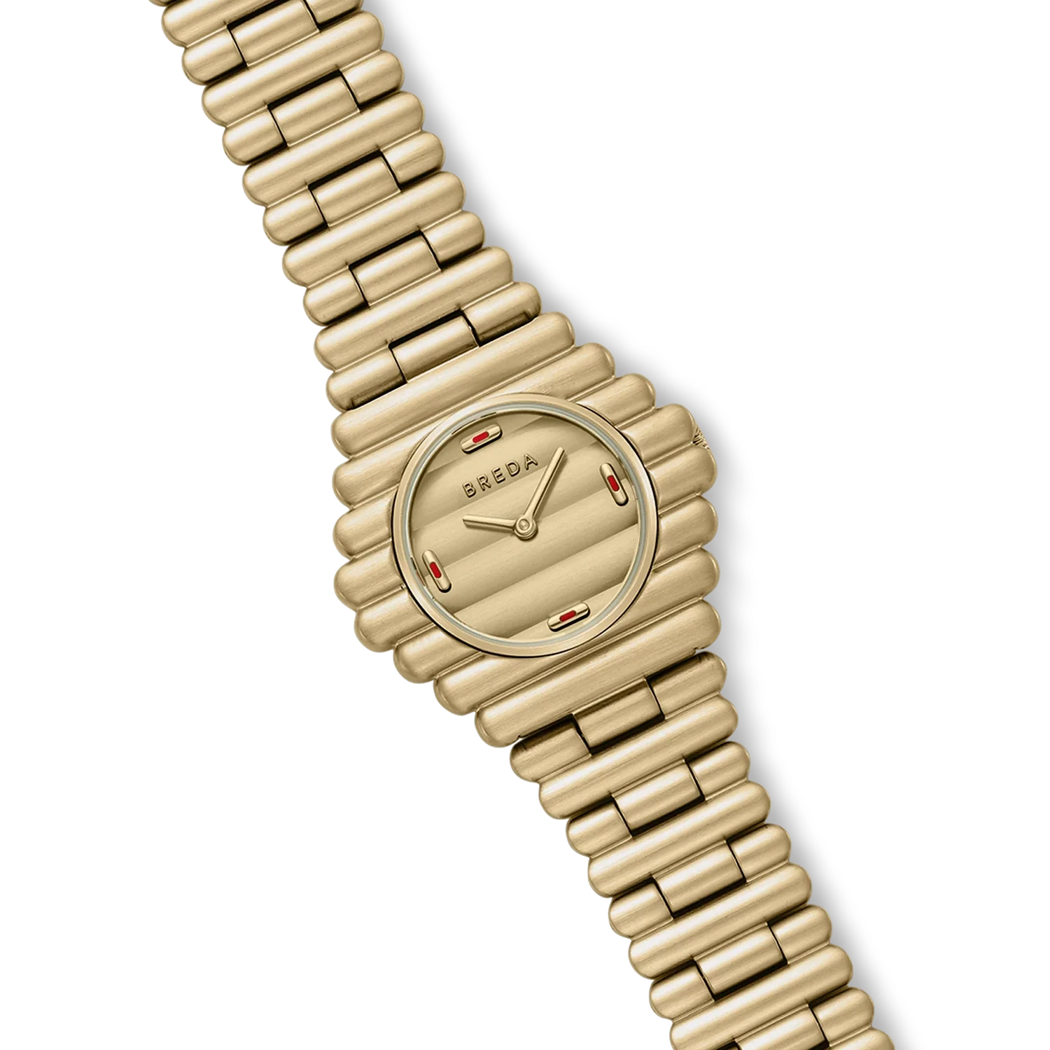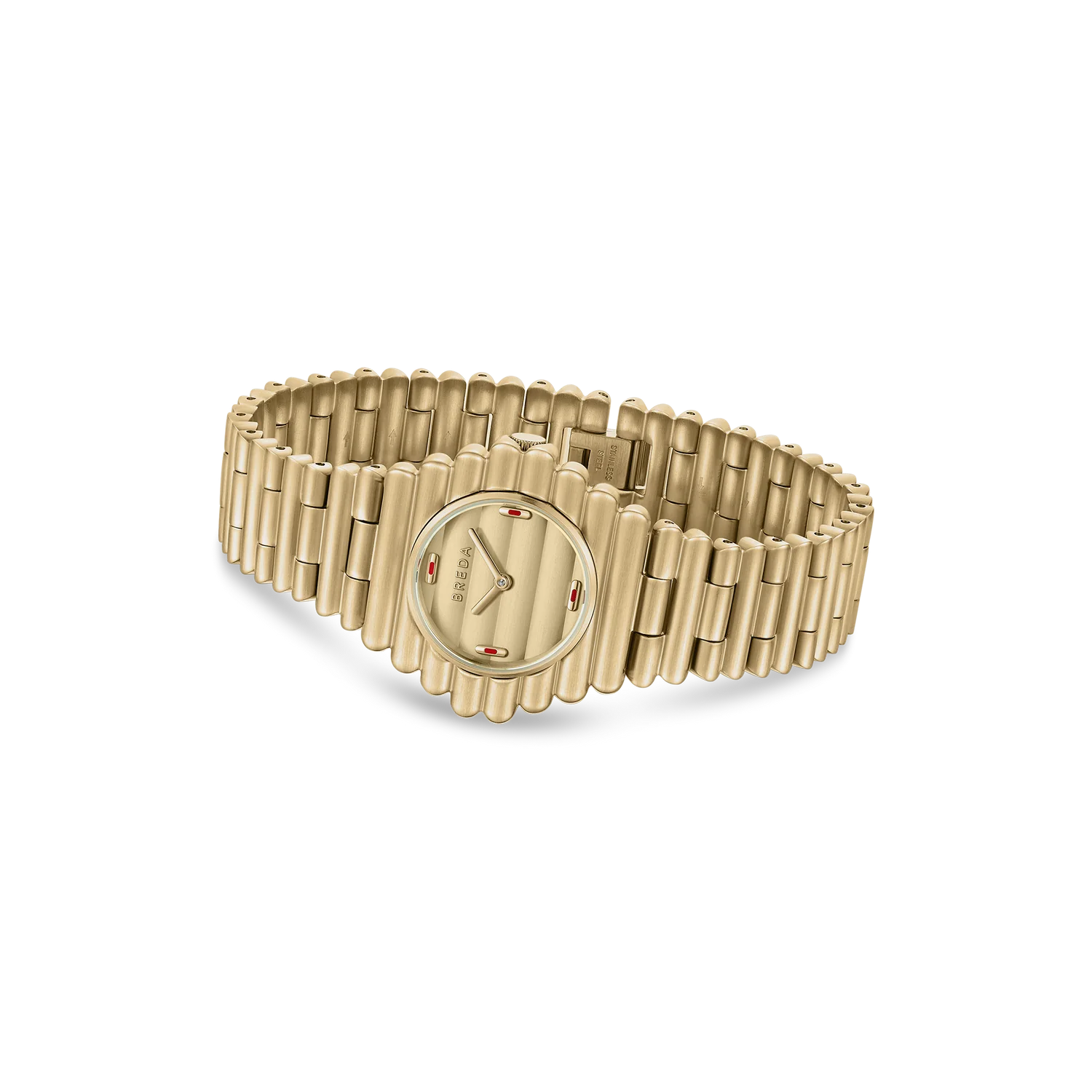 The Coda in Gold celebrates closure as an act of growth. With a silhouette composed of continuous curvature, made from 18K gold-plated stainless steel, that tapers from the 32mm case to the 19mm bracelet, Coda carries a sense of harmony with time. The uninterrupted capsule shape design featured seamlessly through the timepiece creates a subtle yet striking profile around the wrist and fastens with a jewelry clasp. The dial includes subtly placed red enamel hour markers at cardinal points.