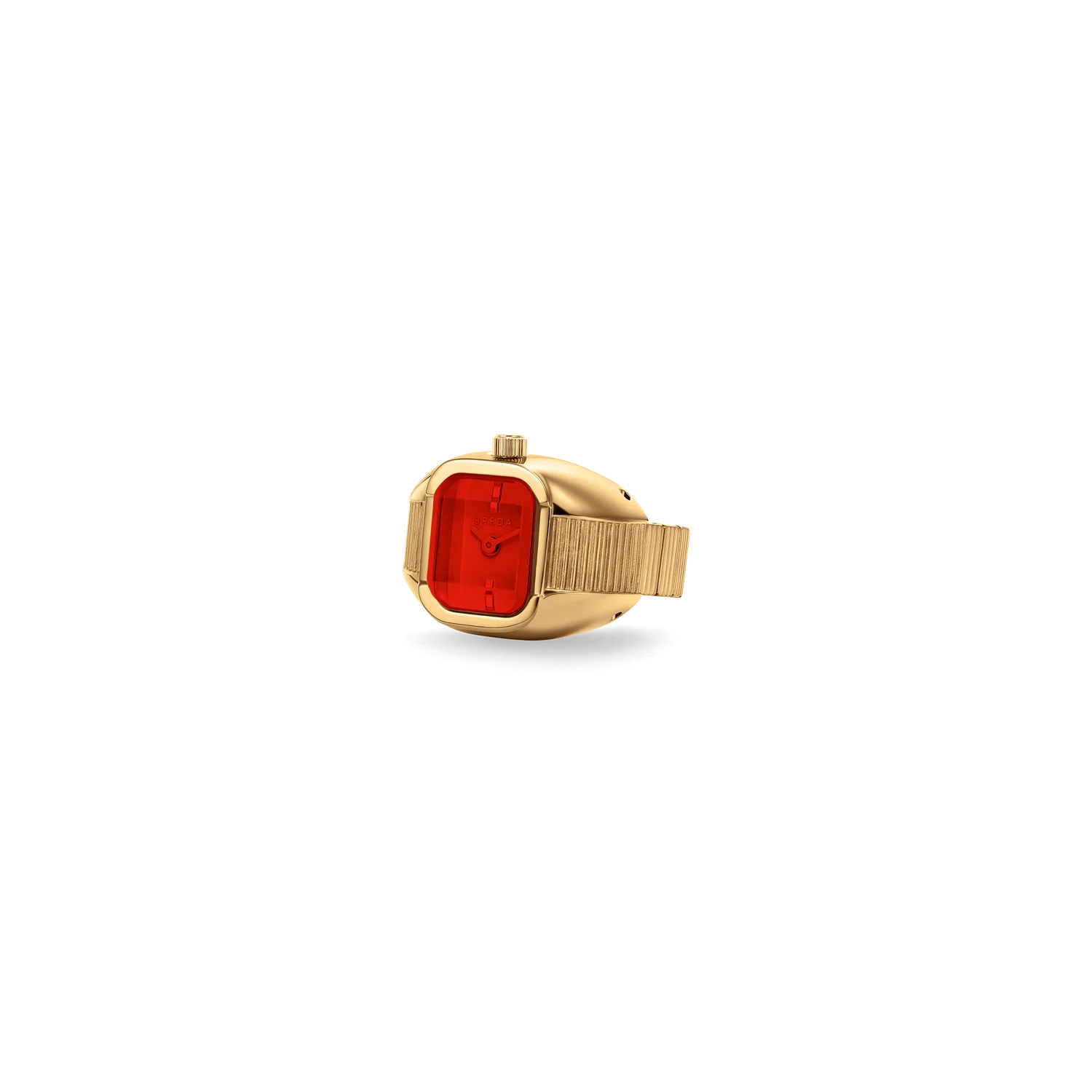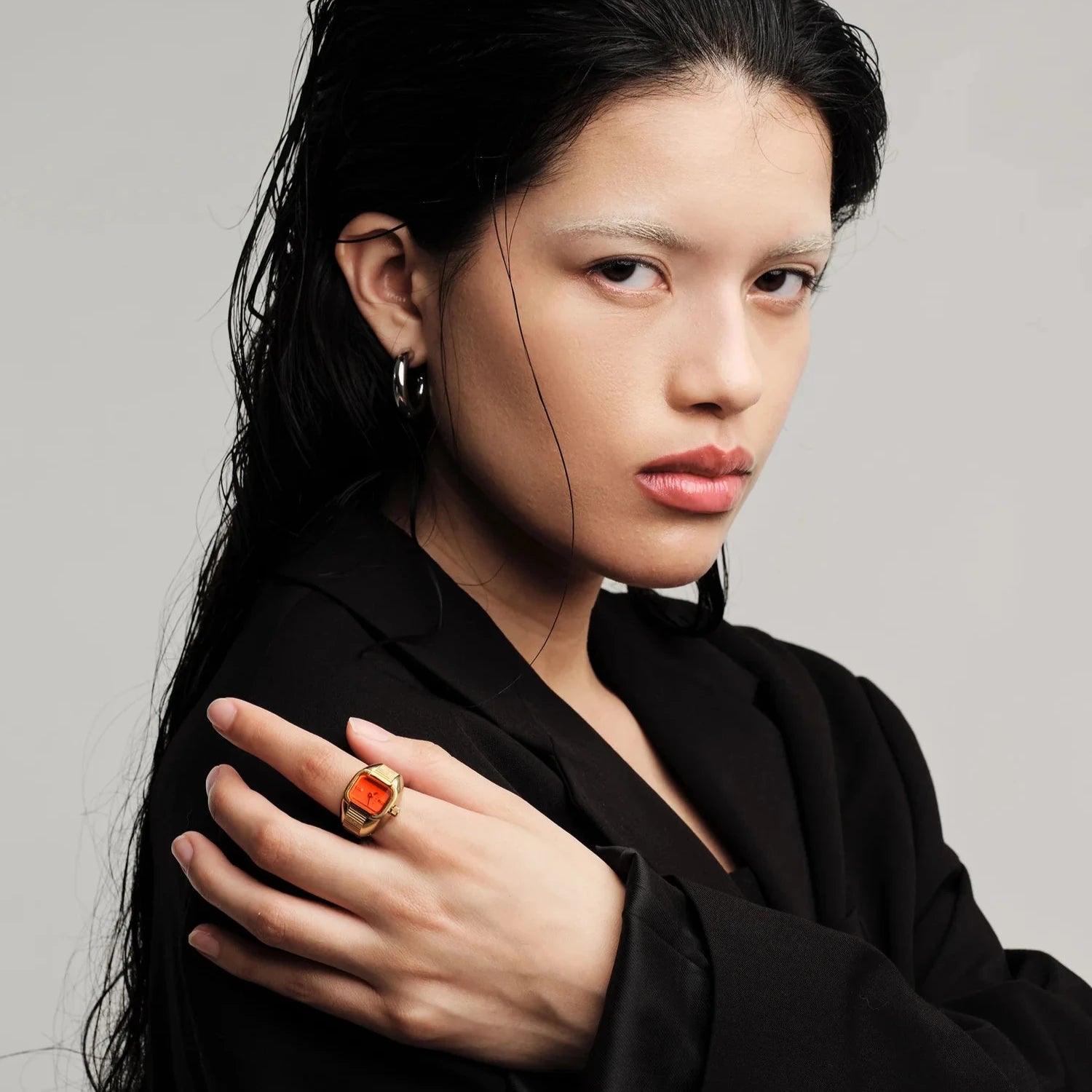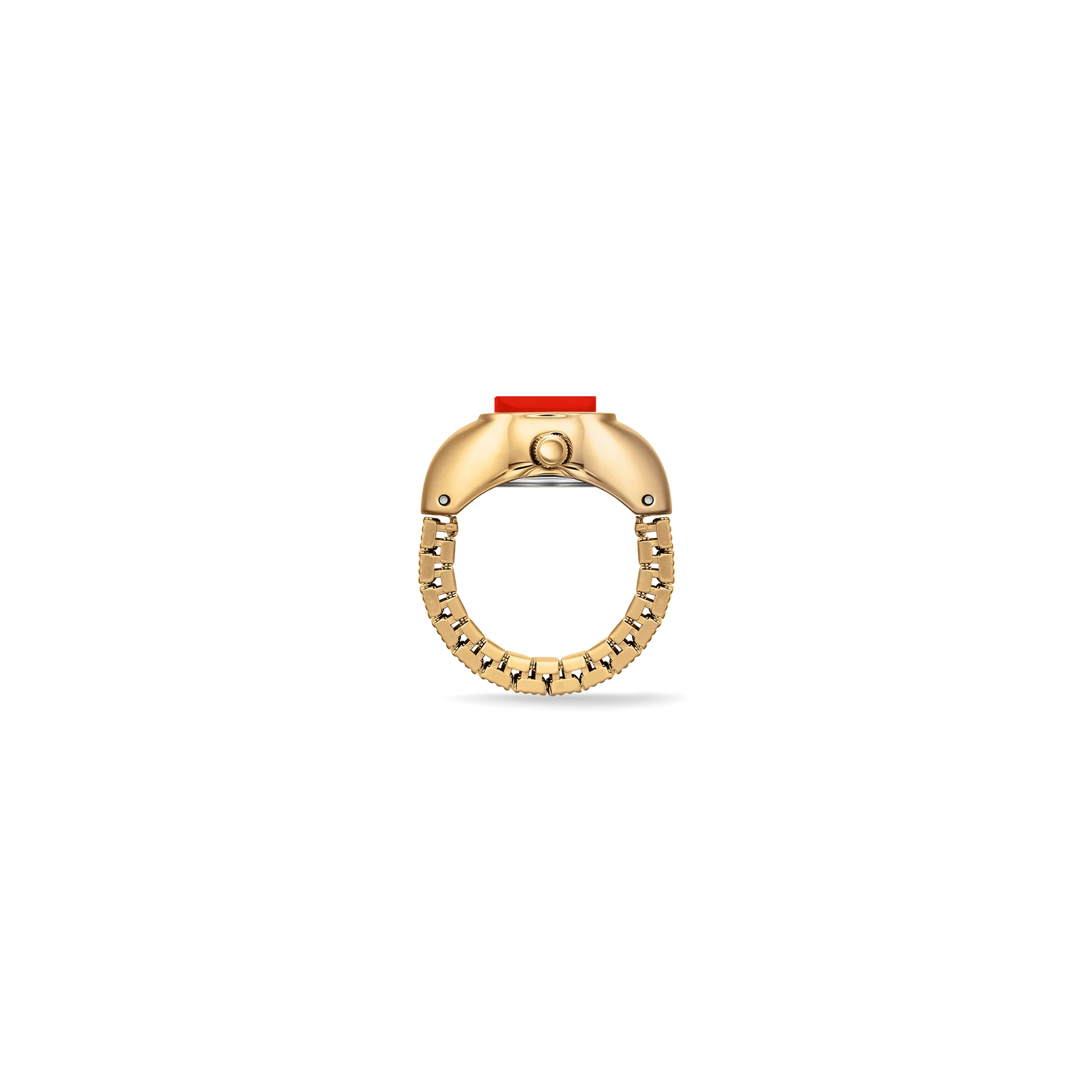 Inspired by the interplay of night and time, each timepiece reflects the essence of nocturnal beauty. The Nocturne Time Ring is composed of a 18K deep gold-plated stainless steel soft-edged 16mm rectangular case and features a flame-colored crystal that meets gold ridges following through the expandable band.