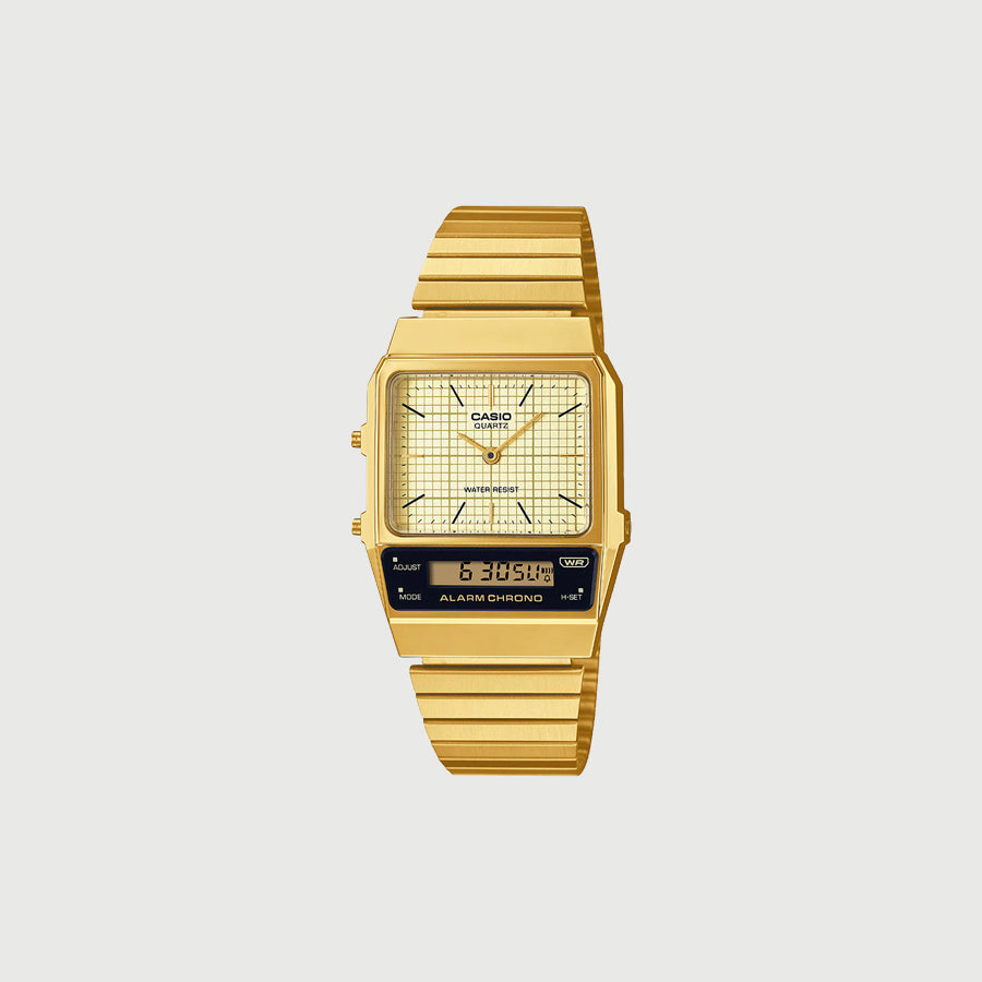 Reboot your retro vintage style with a contemporary update on the 1980s AQ450 design. This brand-new vintage style watch is a beautiful blend of retro and stylish. A separate dial and LCD serve up analog beauty alongside digital performance. The LCD angles gently to follow the lines of the lugs, while the analog dial features simple bar index marks. The watch face adorned in a grid pattern adds the final touch for a real retro feel. The combination of the angular case and the straight links of the metal band is a simple and stylish celebration of structural beauty. More than just a fashion statement, these timepieces deliver practical functions like dual time, stopwatch, and alarm, as well as water resistance for daily use to free you from worry, even on rainy days.