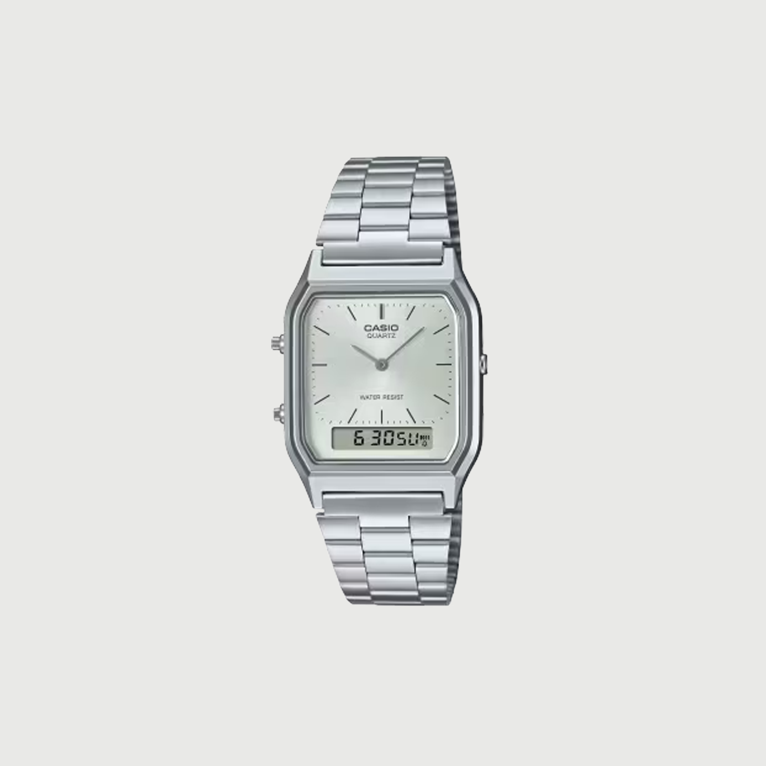 Charmingly classic, trendily colorful. The angular case frames a dial updated in the latest color trends. Retro simplicity meets modern functionality in an analog watch with small digital window for the info you need at your fingertips. A versatile, elegant design to complement every occasion, from dressy formal events to casual outings.